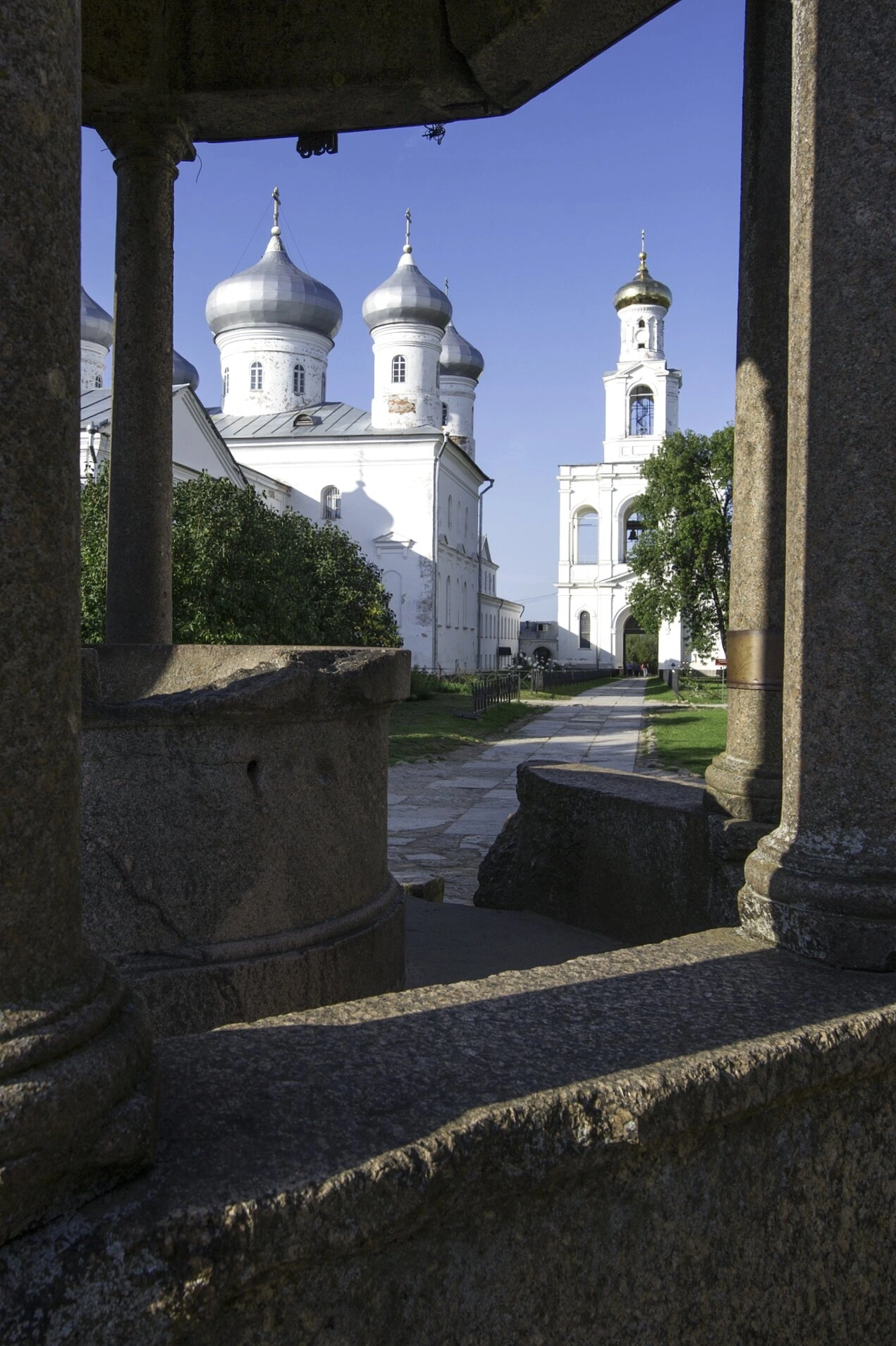 На представленной фотографии запечатлён величественный вид Свято-Юрьева мужского монастыря, одной из древнейших православных обителей России, основанной в 1030 году великим князем Ярославом Мудрым во имя святого великомученика Георгия Победоносца. Снимок выполнен с уникального ракурса — сквозь массивную каменную арку, что символически подчёркивает переход от мирской суеты к священному пространству монастырской крепости, а также придаёт изображению глубину и монументальность.