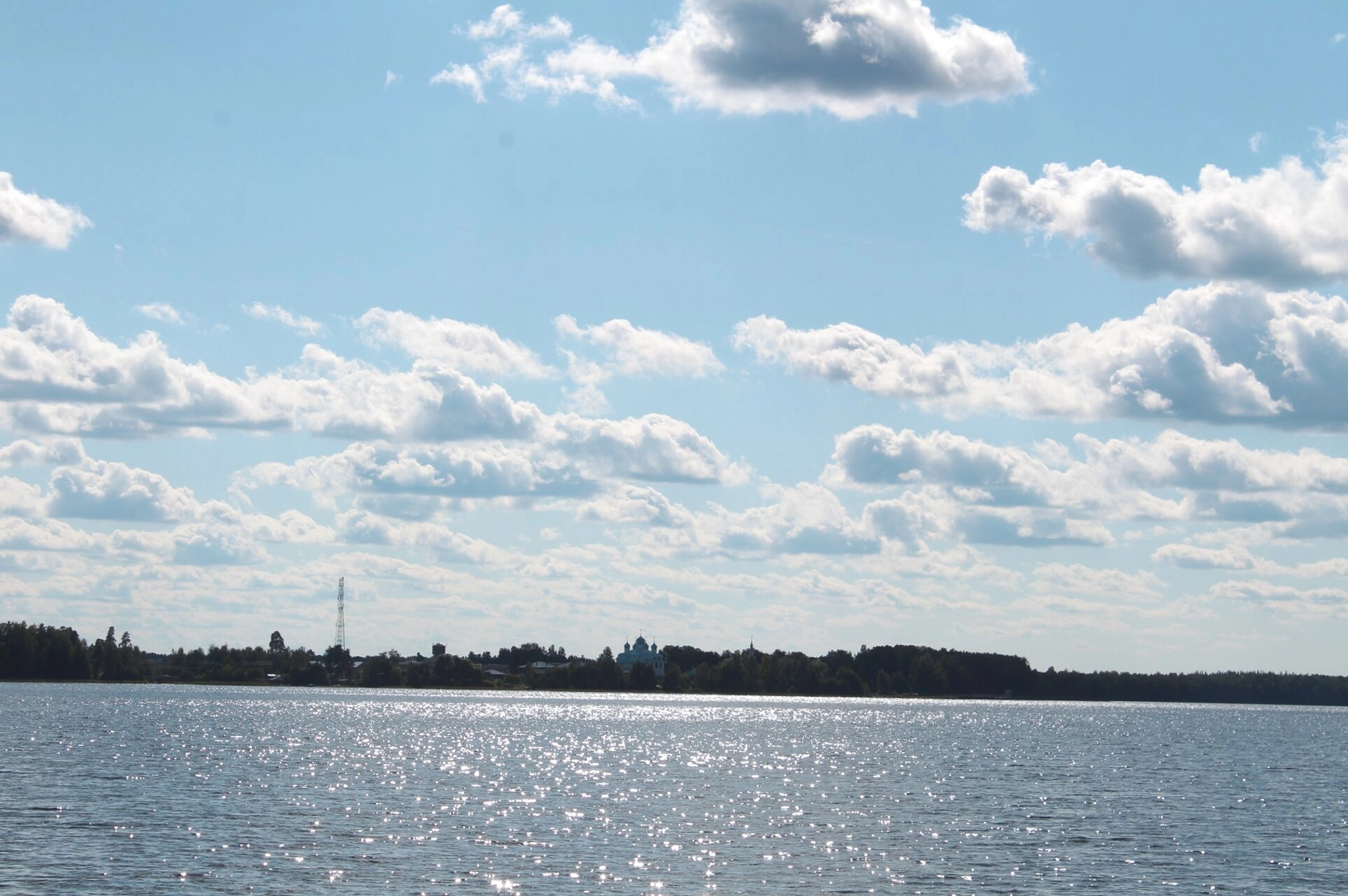 В центре композиции возвышается Преображенская церковь - один из главных храмов монастырского комплекса. Белоснежные стены храма гармонично сочетаются с лазурью небес и водной гладью святого озера. Архитектура церкви отражает лучшие традиции русского церковного зодчества, создавая образ небесного града на земле.