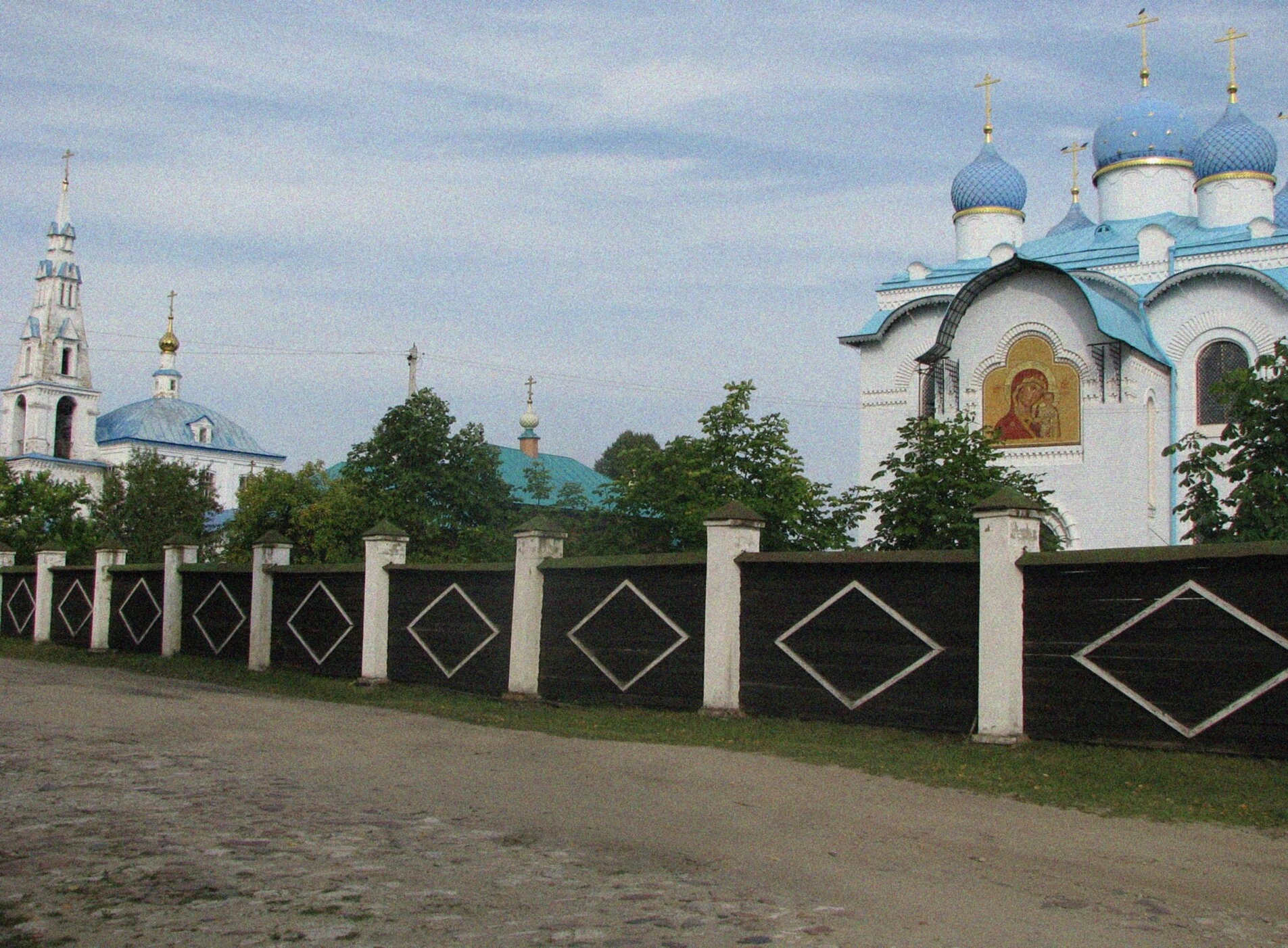 Территорию монастыря ограждает добротный деревянный забор тёмного цвета с изящными белыми декоративными элементами в виде ромбов, что придаёт ограде нарядный и завершённый вид. Эта ограда отделяет святую обитель от мирской суеты, символизируя духовное устремление ввысь.