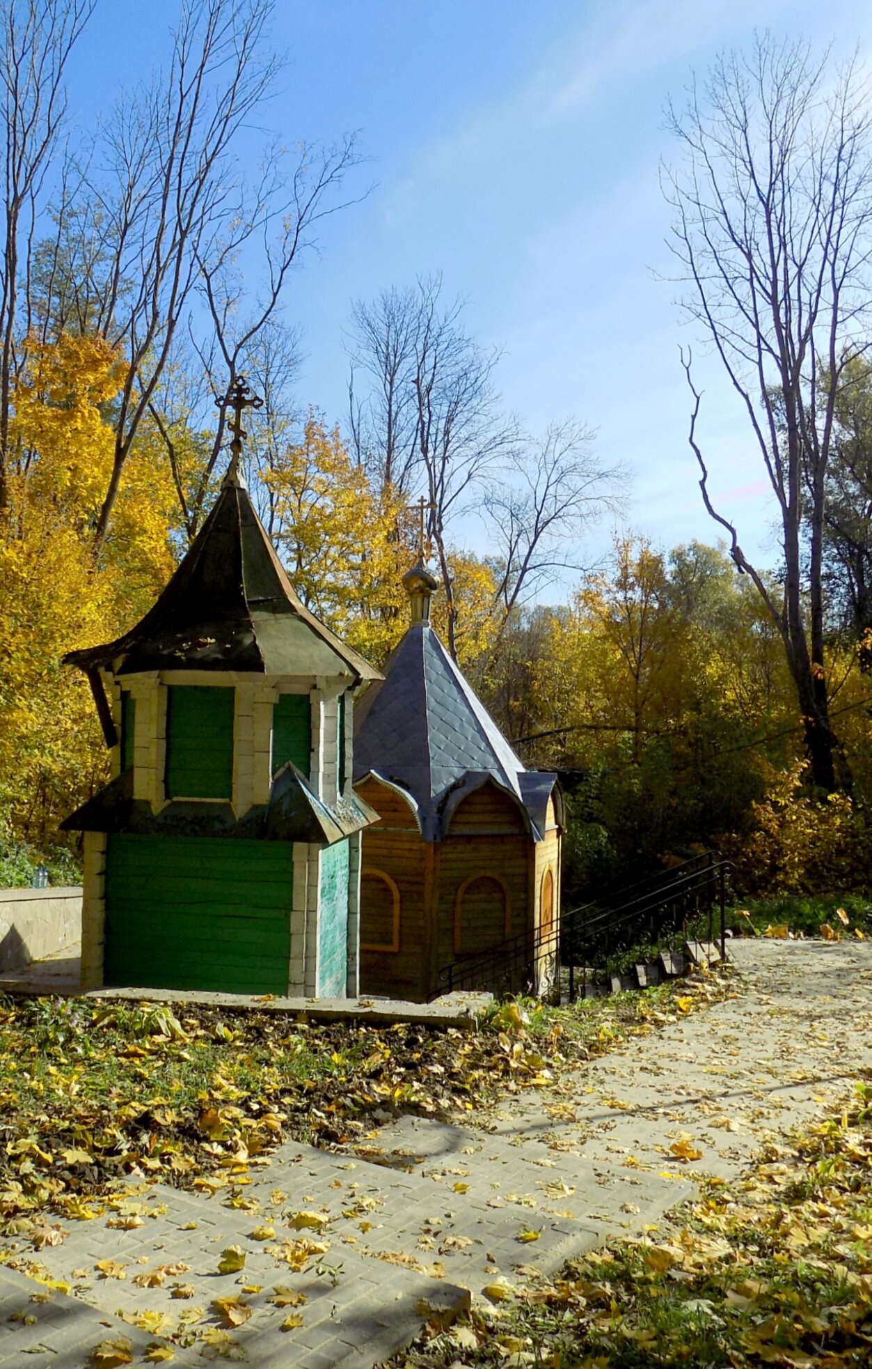 На фотографии запечатлен благодатный уголок Свято-Рождество-Богородичного мужского монастыря Коренная пустынь, что под Курском. Изображение являет нам два священных строения, расположенных у целительного родника, известного как Живоносный Источник. Справа мы видим часовню, освященную в честь чудотворной иконы Божией Матери «Живоносный Источник». Небольшая аккуратная постройка, нижняя часть которой выкрашена в зеленый цвет, символизирующий жизнь и обновление, увенчана темной кровлей со стройным шпилем и православным крестом, возносящимся к небу.