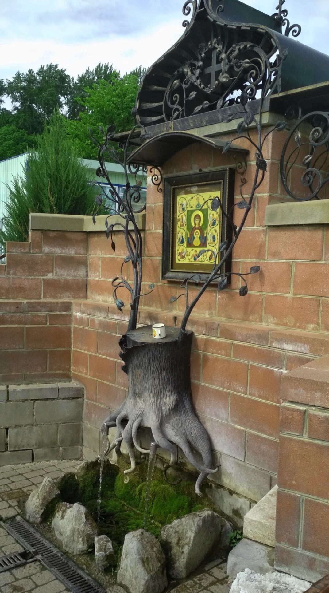 Источник облагорожен благочестивыми трудами: он украшен искусной кованой сенью, имитирующей ветви деревьев, что символически отсылает к истории обретения иконы на корне дерева. В центре композиции установлена икона, перед которой теплится лампада. Из источника непрестанно изливается чистая, прохладная вода, обладающая, по вере молитвенников, благодатной силой. Вода собирается в каменную чашу, а затем стекает в расположенную ниже купальню для совершения православного таинства омовения.