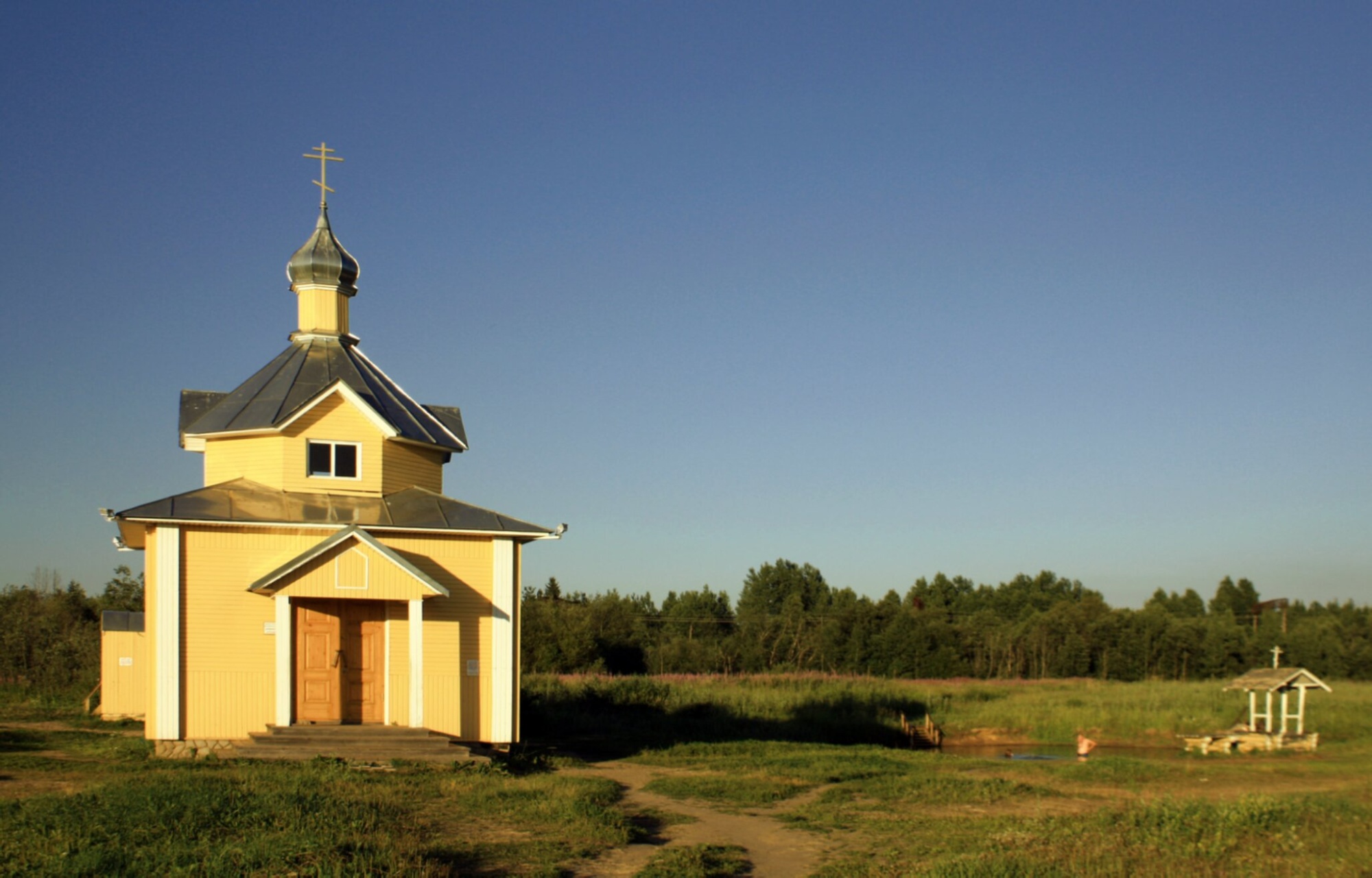 На представленной фотографии запечатлён благодатный уголок Введено-Оятской женской обители — деревянная часовня, возведённая над святым источником, и открытая купель для совершения омовений. Часовня, увенчанная православным крестом, выполнена в традиционном русском архитектурном стиле и гармонично вписана в окружающий природный ландшафт. Рядом с ней располагается деревянный сруб самого источника, также осенённый крестом и украшенный монограммой «НН», что может означать «Источник Николая Чудотворца» или символизировать слова «Новая Надежда».