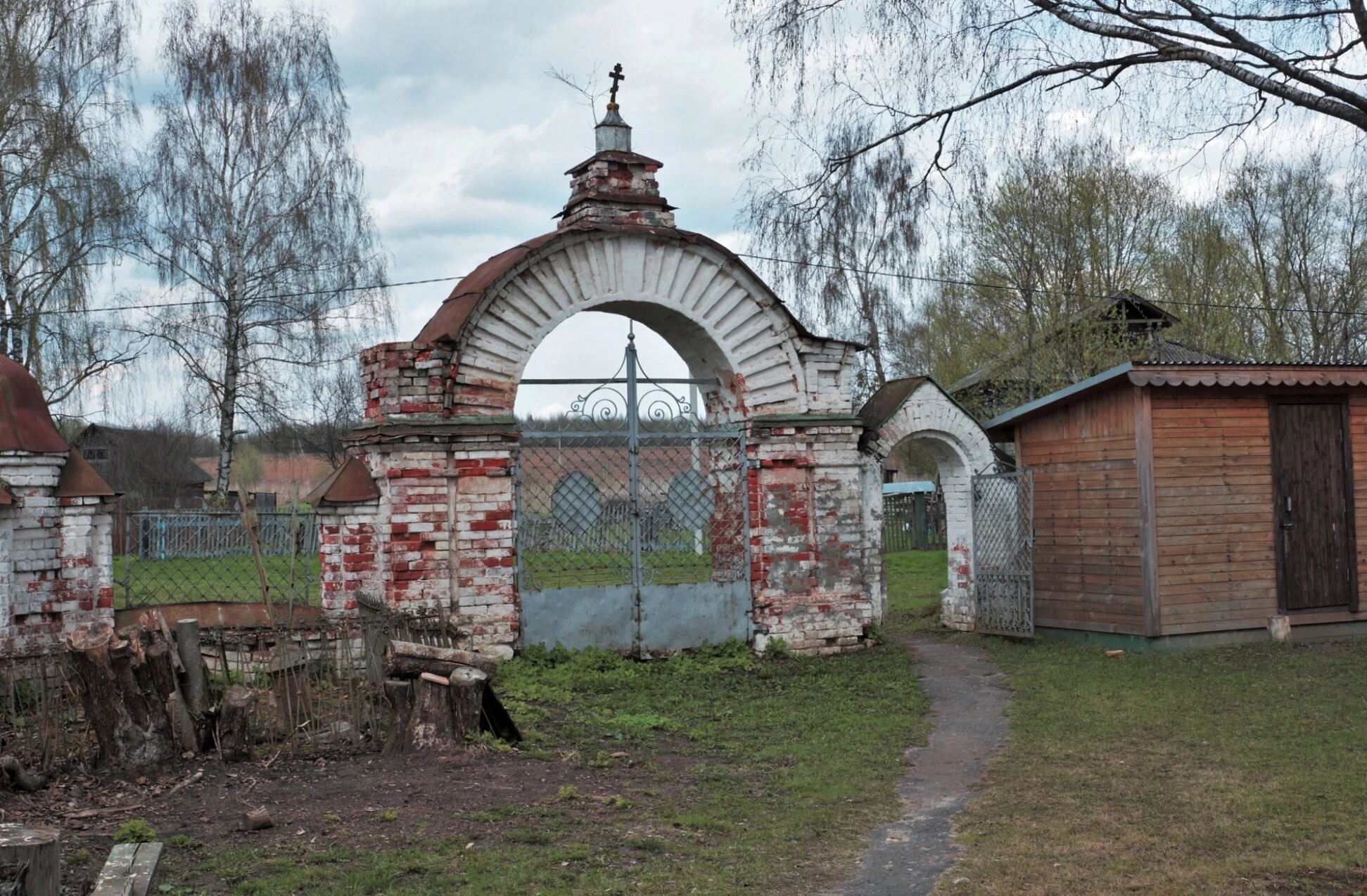 Святые ворота, изображённые на снимке, традиционно служат входом на территорию храма и старинного кладбища, где расположены некрополи известных купеческих фамилий. Их архитектура характерна для периода строительства основного храма и представляет собой историко-культурную ценность. Фотография позволяет рассмотреть детали конструкции — килевидные завершения, рельефно выделенные архивольты и характерную кладку, что даёт представление о мастерстве зодчих той эпохи.