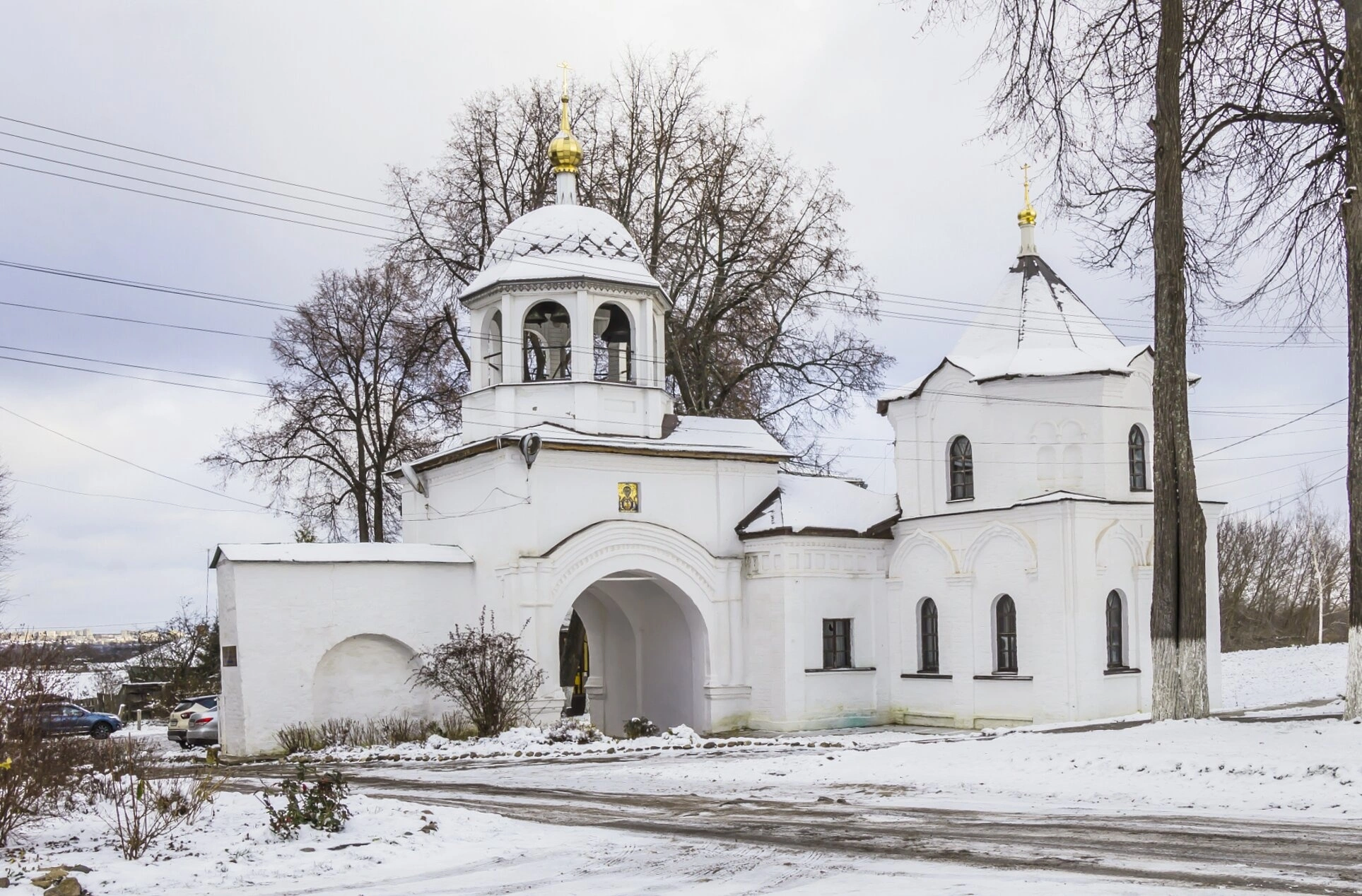 Справа от ворот виден фрагмент одного из монастырских корпусов или храмов, также выполненного из белого камня. Голые ветви деревьев подчёркивают величие древних стен и безмолвную молитву, которой дышит это место даже в лютую стужу. На переднем плане видна заснеженная дорога, ведущая ко входу в обитель — символ духовного пути, ведущего к спасению.