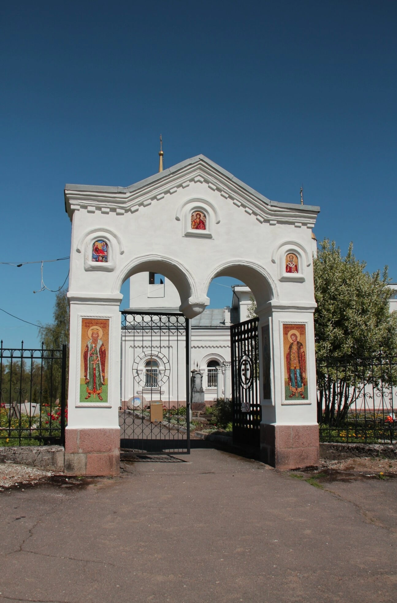 На представленной фотографии запечатлены Святые ворота православного храма в честь Архистратига Михаила, расположенного в деревне Сижно Лужского района Ленинградской области. Ворота являются неотъемлемой частью церковного ансамбля и выполняют важную символическую функцию, обозначая благоговейный переход от мира мирского к пространству священному.
