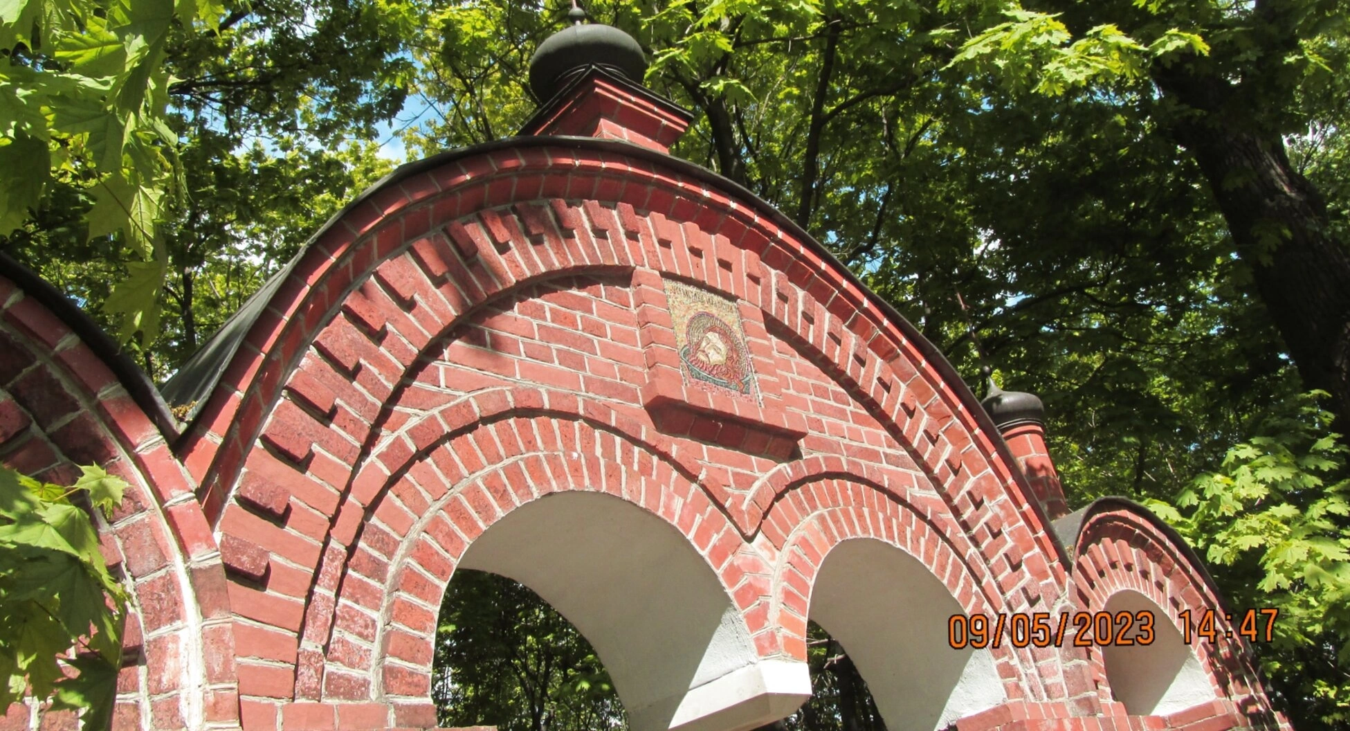 На фотографии запечатлены Святые ворота, ведущие на территорию храма Усекновения главы Иоанна Предтечи, что в бывшем селе Дьякове (ныне в черте Москвы). Эта кирпичная арка, увенчанная православным крестом, является неотъемлемой частью архитектурного ансамбля одной из старейших церквей столицы.