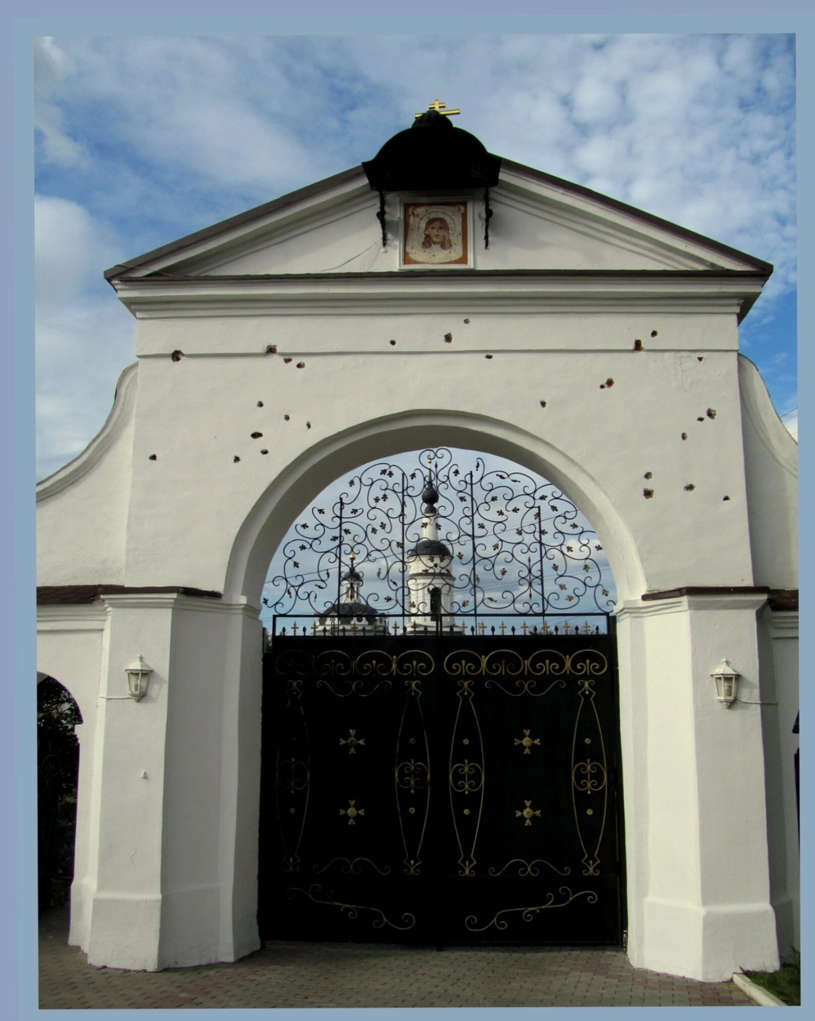 Многочисленные следы на фасаде ворот — это повреждения от пуль и осколков, оставшиеся после ожесточённого сражения с войсками Наполеона в октябре 1812 года. Именно у этих стен решалась судьба Отечества, и по воле Божией враг не смог проникнуть в обитель. Эти знаки воинской славы бережно сохраняются как напоминание о божественном заступничестве и жертвенном подвиге русского воинства.