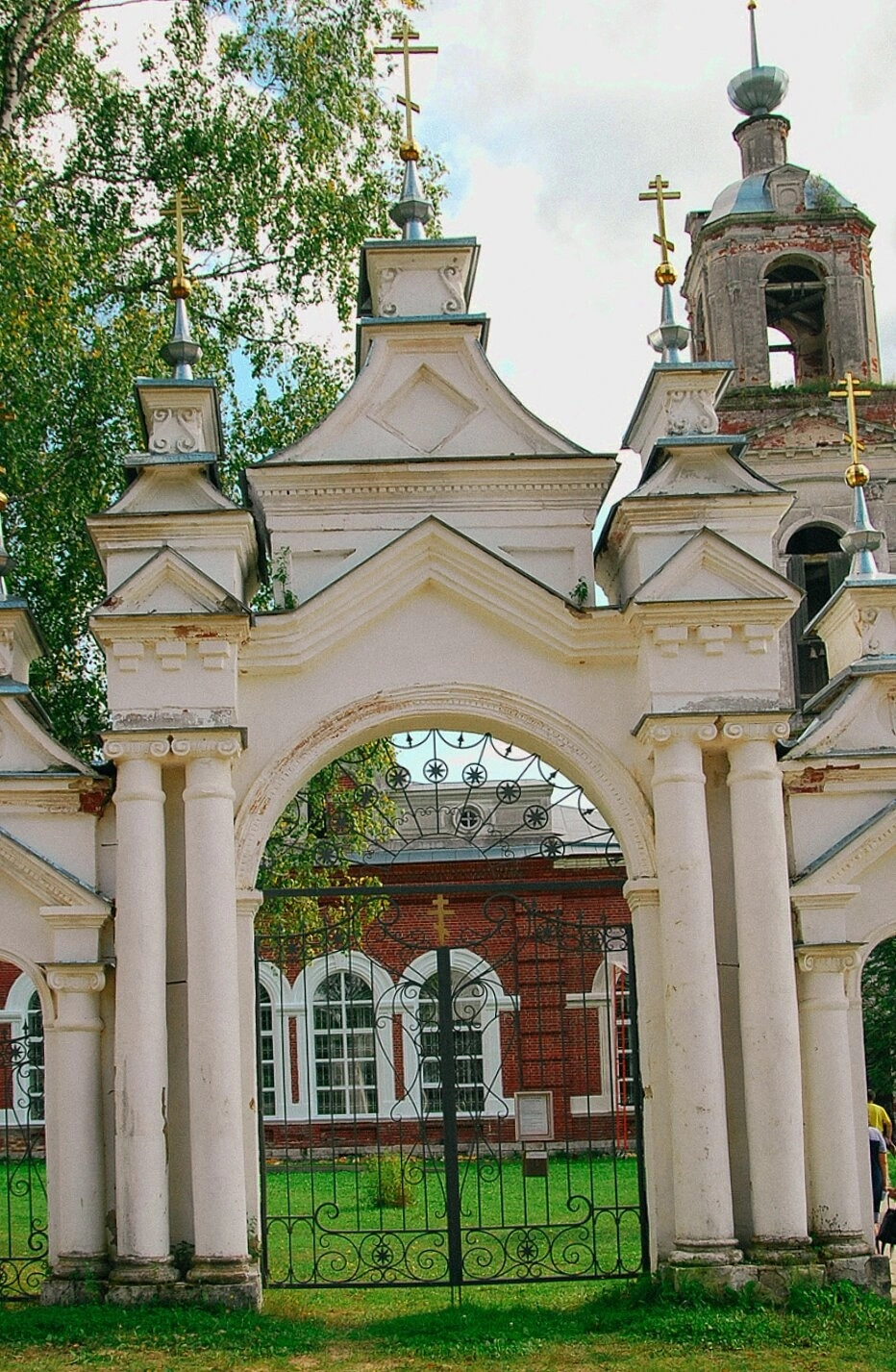 На представленной фотографии запечатлены Святые ворота храма Святителя Николая Чудотворца, что в местечке Николо-Ямы Тверской области. Врата, выполненные в благородном стиле барокко, представляют собой монументальное сооружение с тремя арочными проходами, увенчанными изящными куполами с водружёнными на них православными крестами.