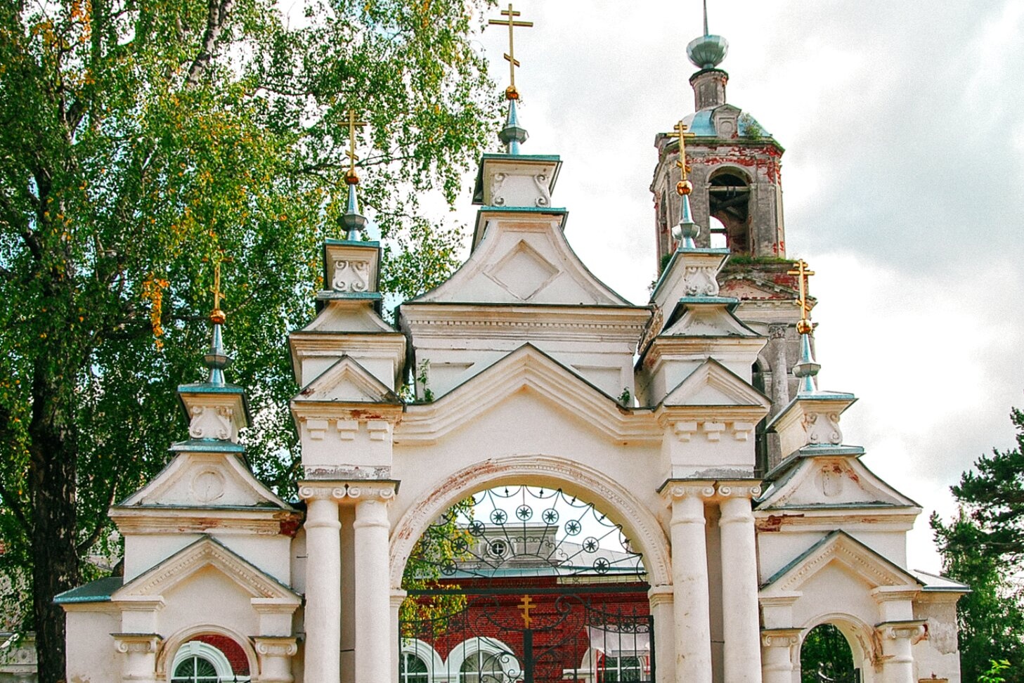 На представленной фотографии запечатлены Святые ворота Никольской церкви, расположенной в селе Николо-Ям Тверской области. Храм освящён в честь святителя Николая Чудотворца, особо почитаемого в православной традиции.