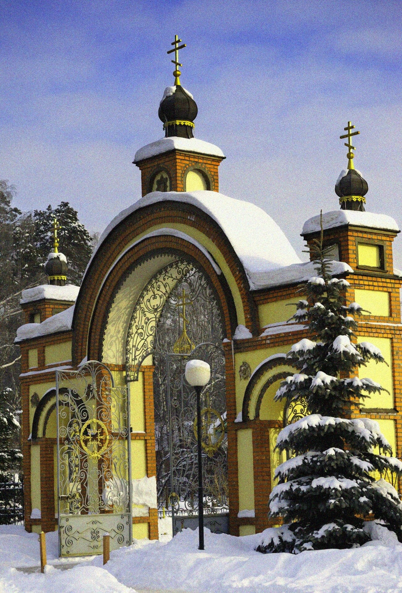 Зимняя природа добавляет пейзажу особую торжественную тишину и умиротворение. Обильный снег покрыл крыши ворот, землю и ветви растущей рядом хвойной ели, чья зелень эффектно контрастирует с белизной снега. Яркое зимнее солнце освещает архитектуру, создавая глубокие и чёткие тени, которые подчёркивают объём и детали кладки, лепнины и ковки. Чистое голубое небо с легкими облаками усиливает ощущение светлого и радостного праздника.