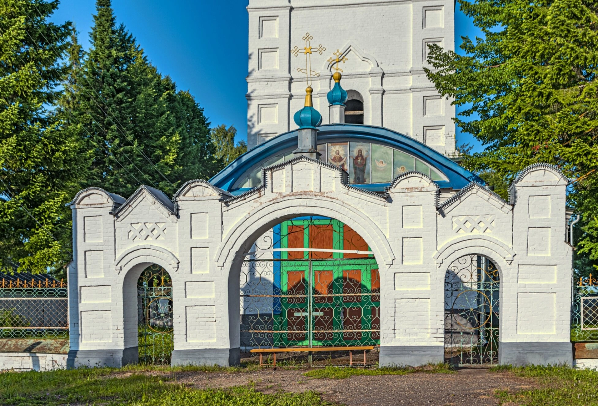 На представленной фотографии запечатлены Святые врата, ведущие на территорию храма Покрова Пресвятой Богородицы в старинном селе Падерино Дальнеконстантиновского района Нижегородской области. Этот величественный вход, выполненный в традиционном русском стиле, является уникальным образцом церковной архитектуры и предваряет путь верующих к храму.