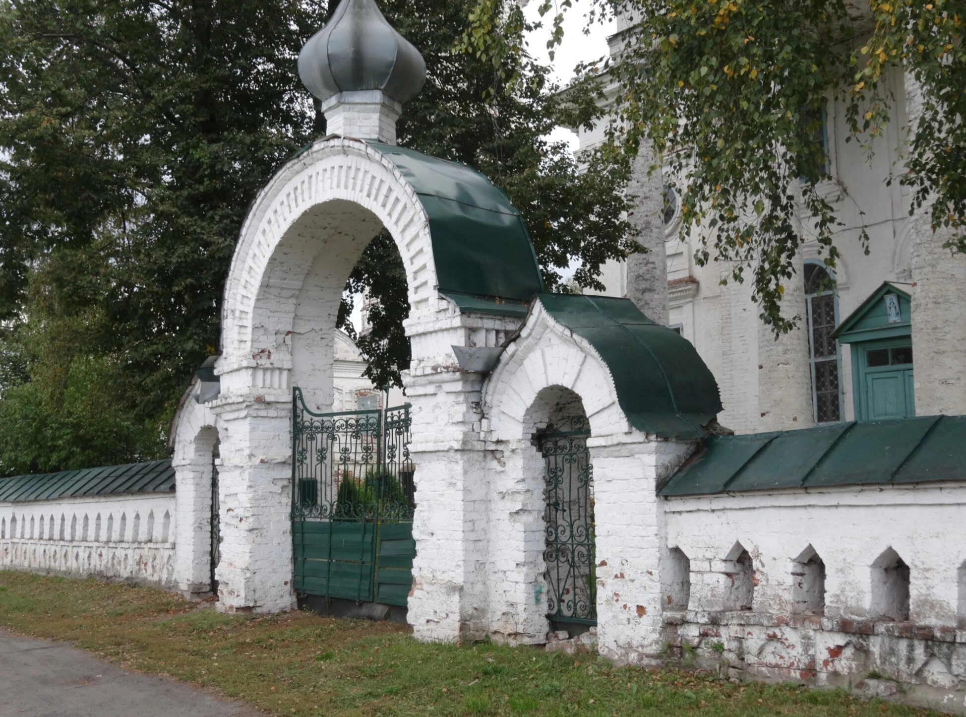 Ограда, примыкающая к воротам, также сложена из белого камня и имеет массивное кирпичное основание, что придаёт всей конструкции особую монументальность и долговечность. На заднем плане фотографии, справа от ворот, виден фрагмент белоснежного здания самой Троицкой церкви, чьи архитектурные формы скрываются в зелени окружающих деревьев.