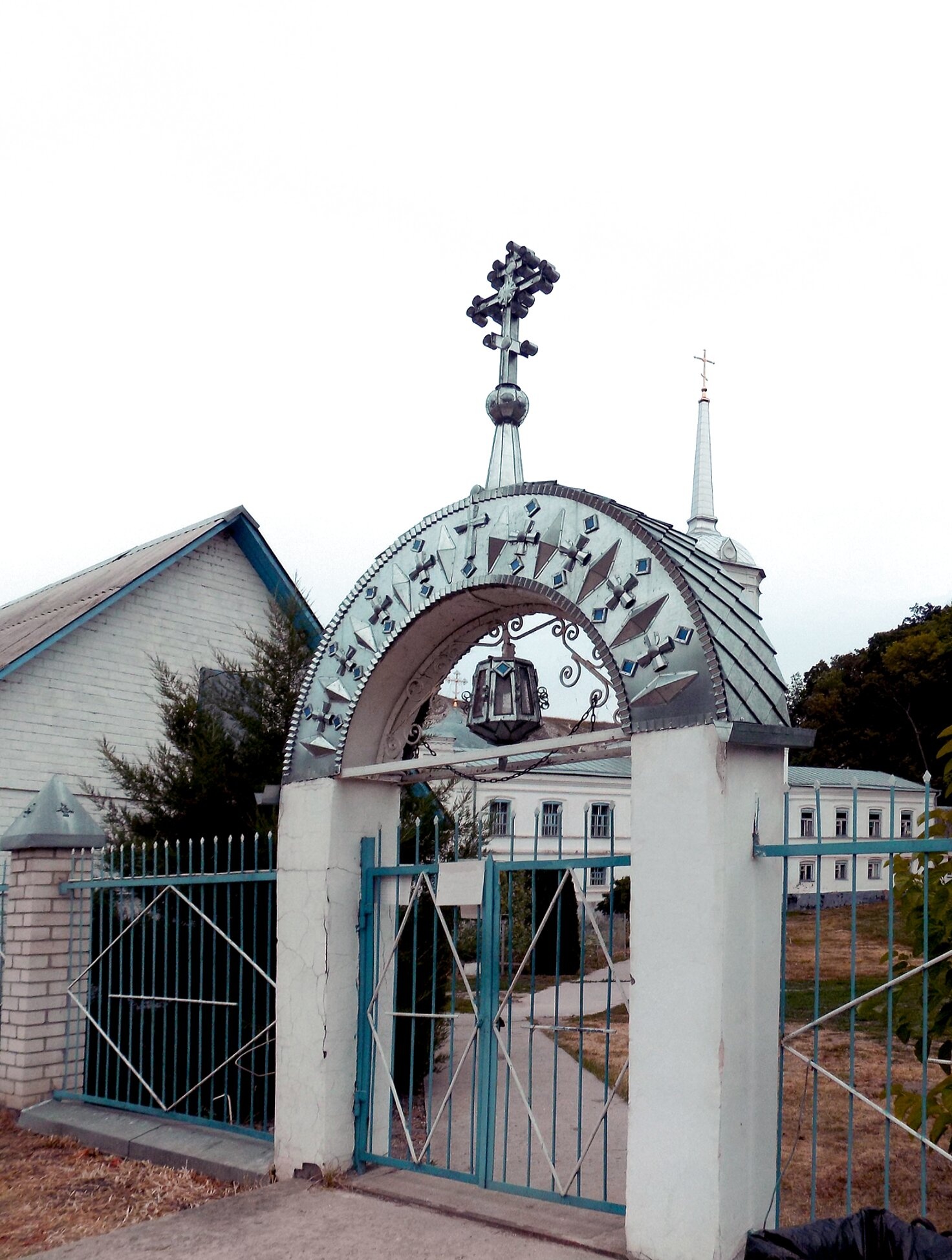 В центре кадра возвышаются главные входные ворота, выполненные в традиционном церковном стиле. Они представляют собой кованую конструкцию синего цвета с арочным сводом, увенчанным православным восьмиконечным крестом, что символизирует врата в духовный мир и спасение. Металлические элементы ворот украшены изящным кованым орнаментом, подчёркивающим значимость входа на освящённую территорию монастыря.