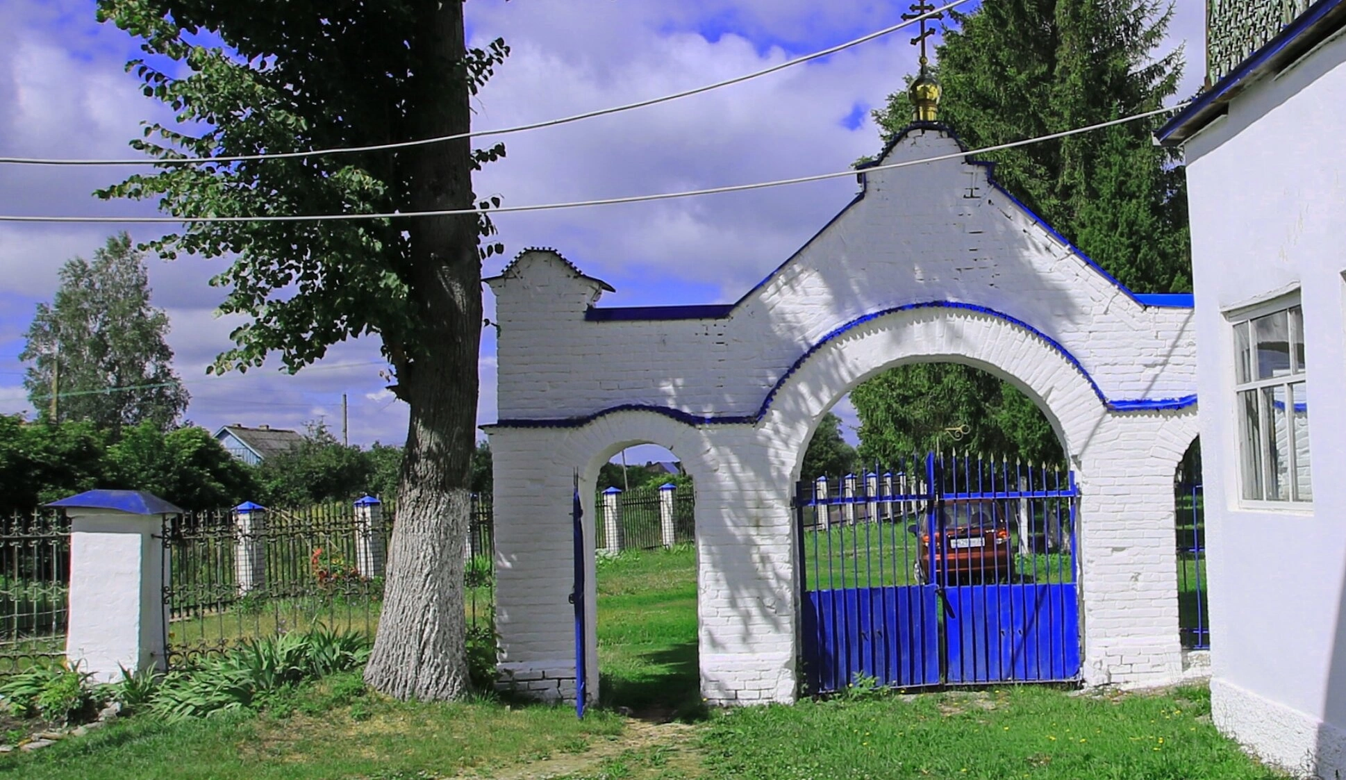 На представленной фотографии запечатлены святые ворота, ведущие на территорию храма в честь Успения Пресвятой Богородицы, расположенного в селе Радогощь. Входная группа выполнена в виде монументальной каменной арки, окрашенной в белый цвет, с декоративными синими элементами и массивными синими металлическими створками. Над вратами возвышается православный восьмиконечный крест, символизирующий искупительную жертву Христа и освящающий вход на церковную землю.