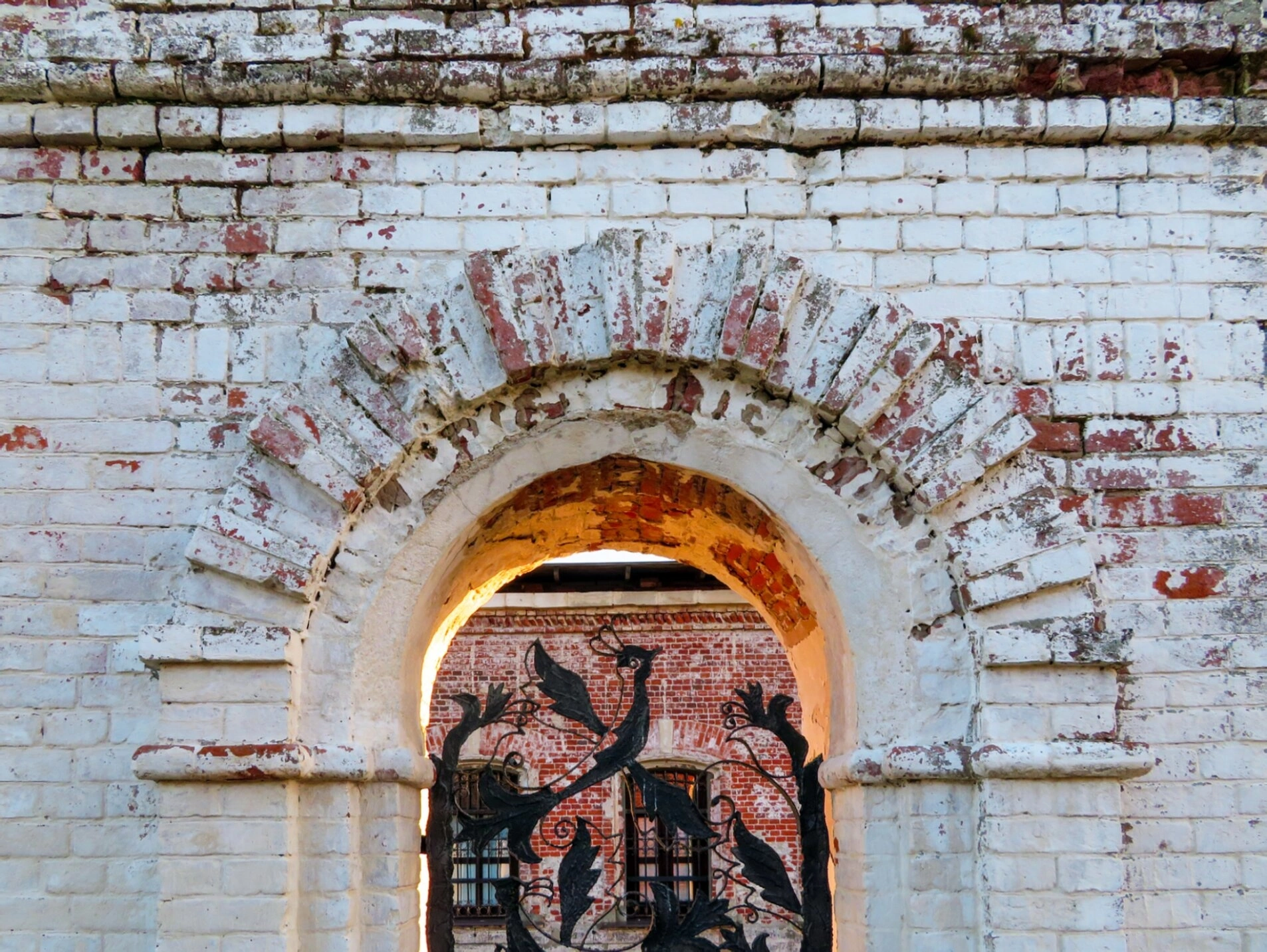 Арочный проём, увенчанный крестом, обрамлён массивными кирпичными пилонами. Фасад ворот имеет следы времени: местами облупилась старинная побелка, обнажая благородную фактуру кирпичной кладки, что придаёт памятнику особую атмосферу духовной старины и величия. Сквозь арку открывается вид на один из храмовых корпусов и ажурную кованую решётку с растительным орнаментом, символизирующую Райский сад и охраняющую священное пространство.