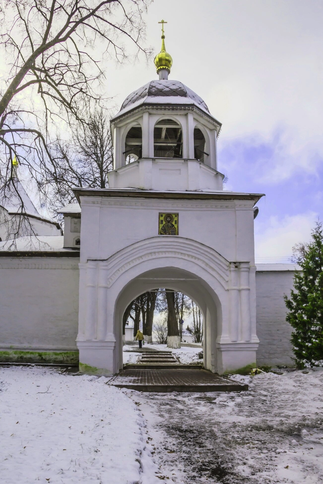 Белоснежная арка врат украшена святым образом, а над ней величественно возносится к небу надвратная колокольня, увенчанная злаченой главкой с животворящим крестом. В зимнее время, когда снимок был сделан, врата и окружающий пейзаж укутаны белоснежным покровом, что придает всей композиции особую благодатную чистоту и строгость. Заснеженные ели и деревья без листвы молчаливо свидетельствуют о величии Божьего творения.
