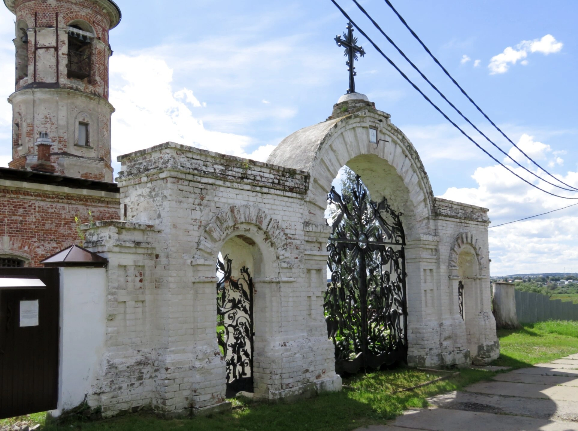 Архитектура ворот гармонично сочетается с обликом самого храма, представляя собой ценный образец русского церковного зодчества конца XVII — начала XVIII веков. На фотографии хорошо читается их монументальная конструкция и лаконичный декор, характерный для данного периода.