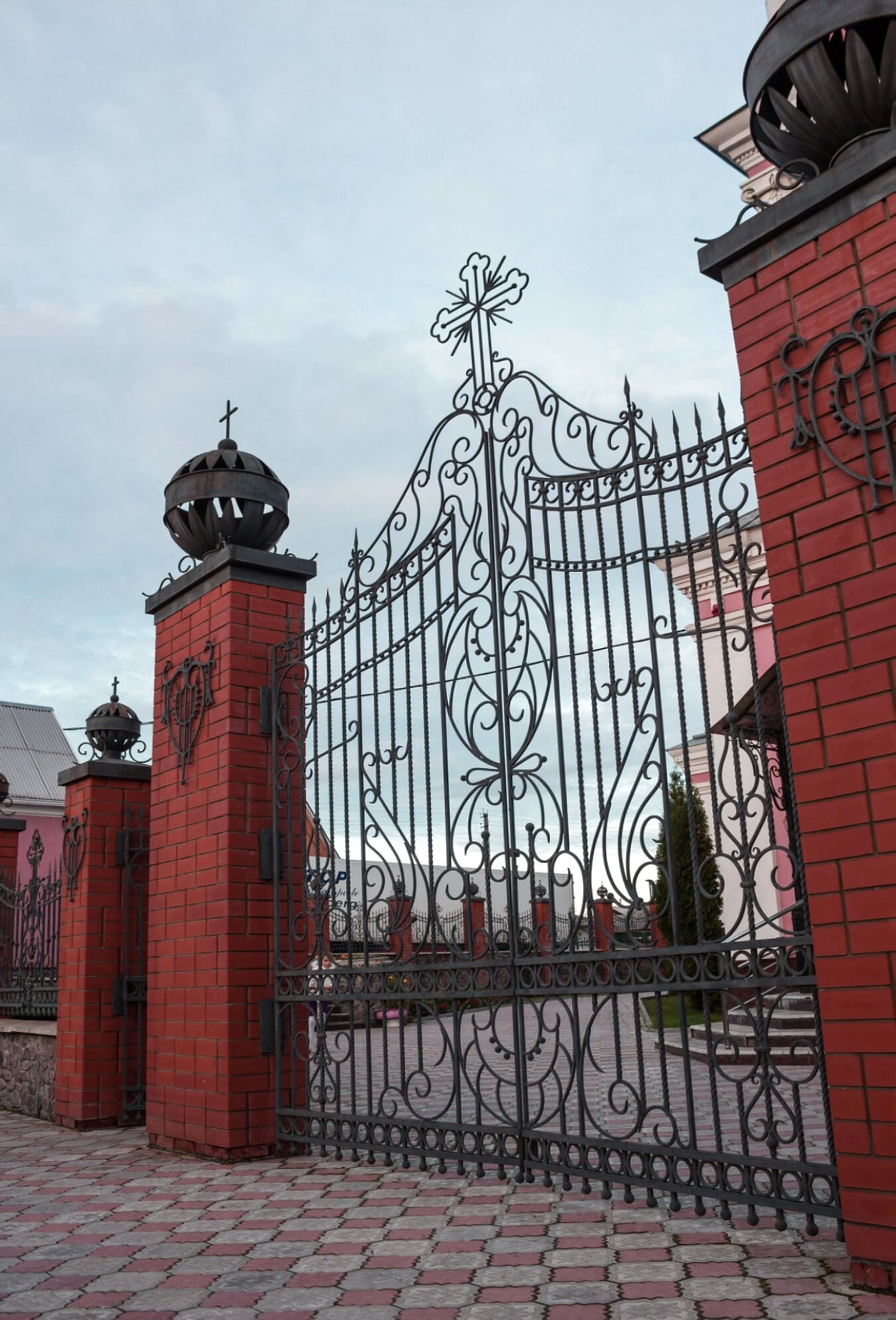 Ворота обрамлены мощными кирпичными столбами, которые завершаются изящными главками, покрытыми кровлей и также увенчанными золочёными крестами. Это архитектурное решение подчёркивает значимость входа в дом Божий как начала пути к духовному очищению. Декоративные кованые элементы, украшающие как створки ворот, так и ограждение, свидетельствуют о высоком мастерстве кузнецов и внимании к деталям.
