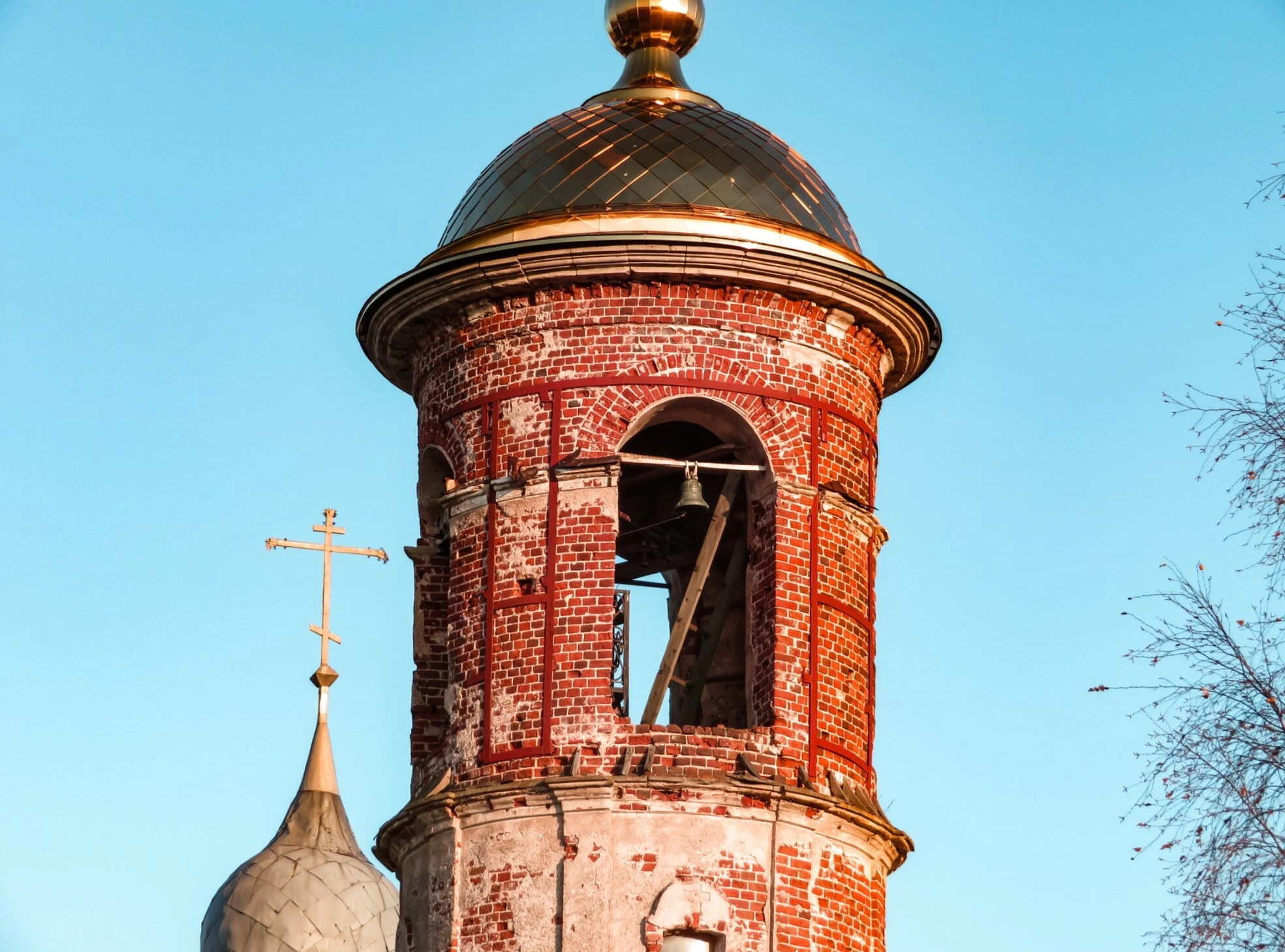 За святыми вратами просматривается часть колокольни храма, сложенной из кирпича. Её архитектурный облик, характерный для русских церковных построек, несёт на себе следы времени, напоминая о долгой истории этой святыни. Храм Бориса и Глеба в Дракино является значимым духовным центром и объектом культурного наследия, привлекающим паломников и ценителей старины.