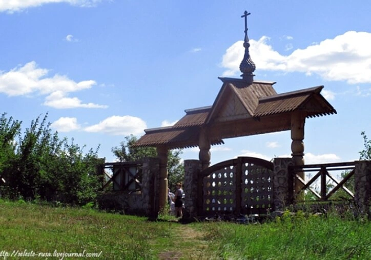 На представленной фотографии запечатлены святые врата мужского монастыря в честь Честного и Животворящего Креста Господня, что в Заволжье, близ села Подгоры Самарской епархии. Монастырь, также известный как Заволжский Крестовоздвиженский, был основан в 2003 году по благословению Высокопреосвященнейшего Сергия, Архиепископа Самарского и Сызранского, на месте явления чудотворного креста.
