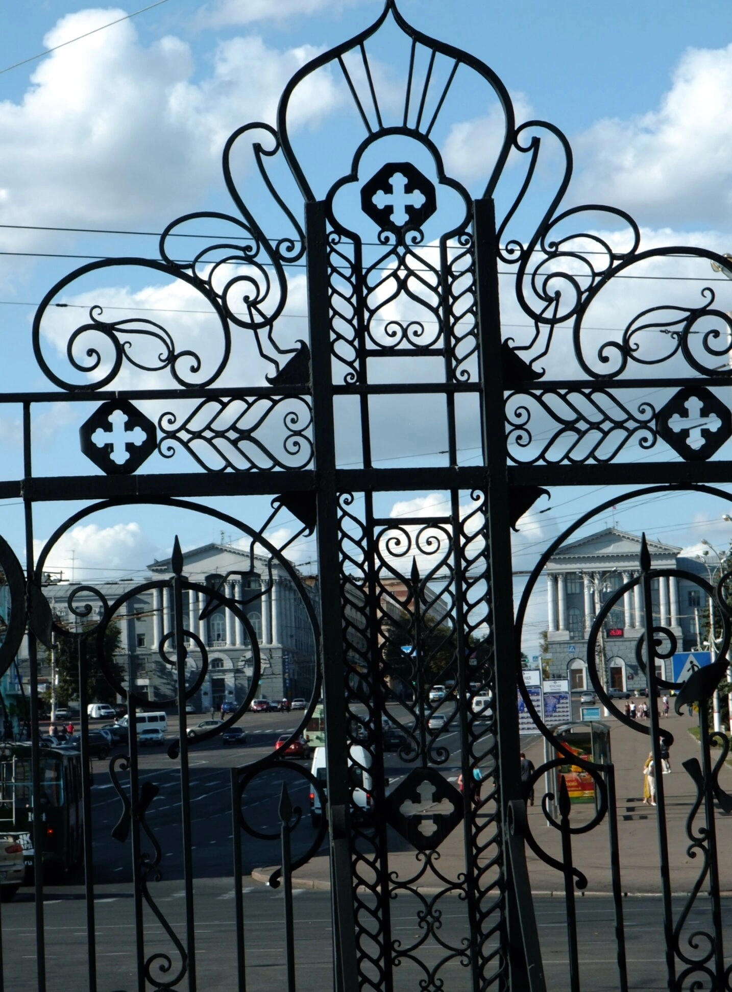 На представленной фотографии запечатлены массивные кованые ворота, являющиеся частью ограды Курского Знаменского мужского монастыря — одной из главных православных святынь Курской земли. Эти врата, расположенные со стороны улицы Луначарского, служат входом на святую монастырскую территорию и отличаются искусной работой кузнецов.