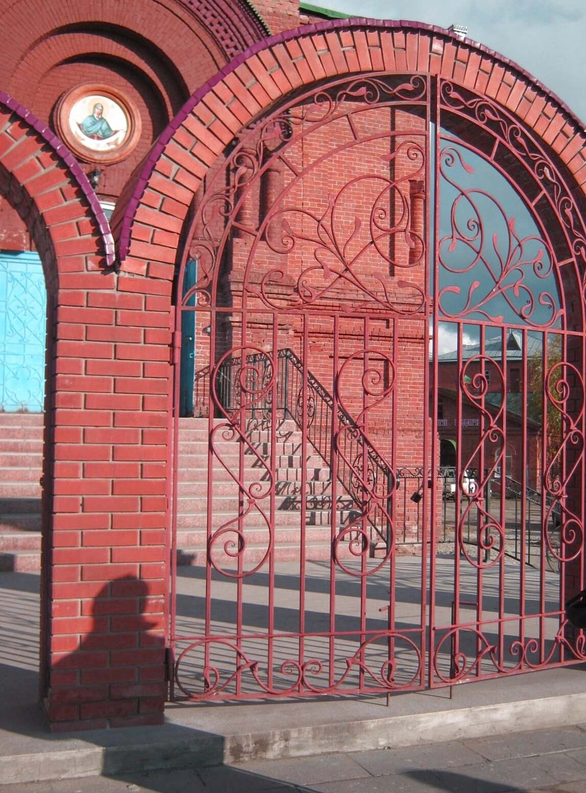 Врата выполнены из кованого металла с искусным ажурным орнаментом, что свидетельствует о высоком мастерстве кузнецов. Их прочность и в то же время воздушность зримо воплощают идею духовной защиты и открытости верующим. Над вратами, в закомаре кирпичной арки, размещена икона, осеняющая всех входящих благословением.