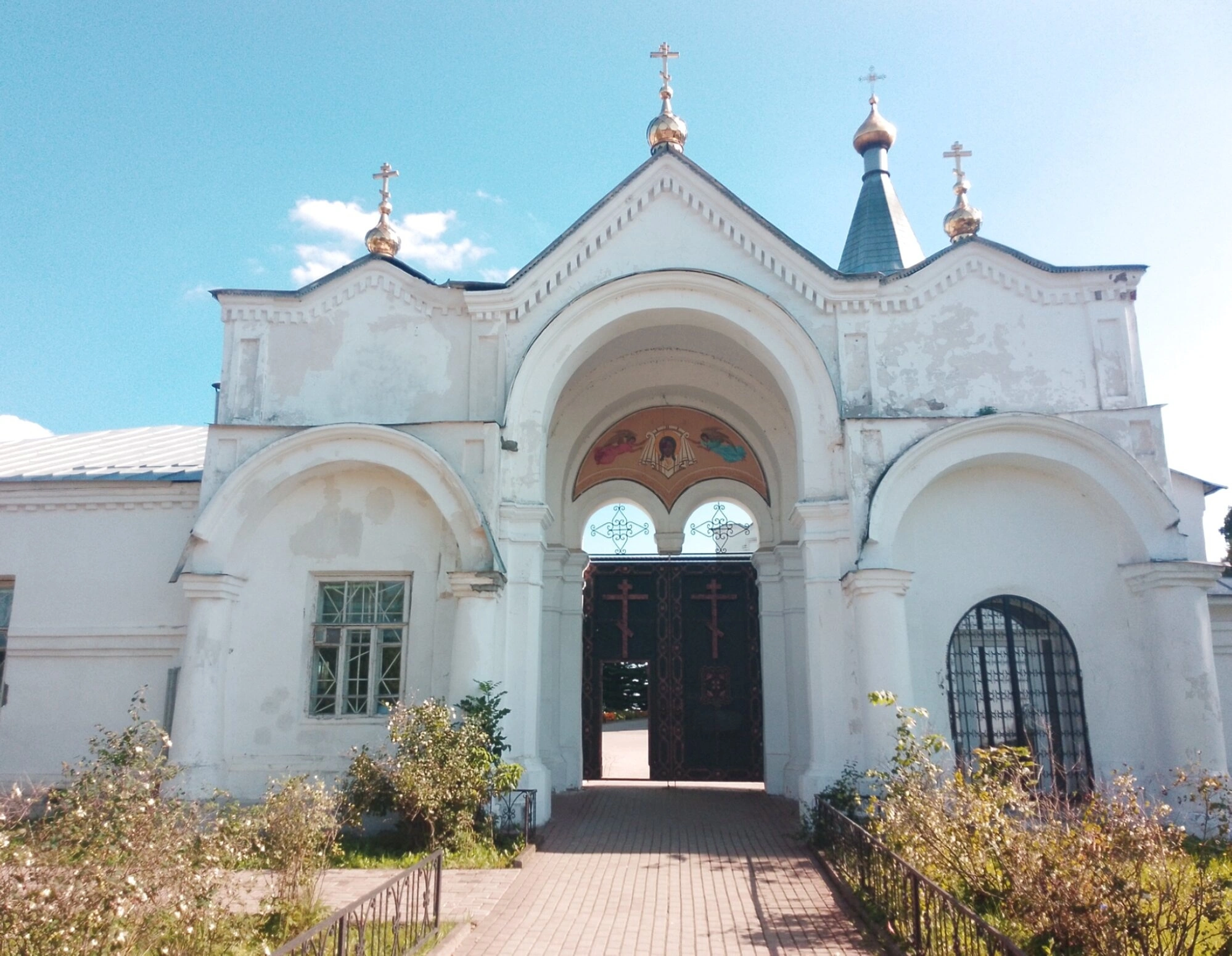 На представленной фотографии запечатлены Святые врата — главный вход в Спасо-Преображенский мужской монастырь, что располагается в древнем городе Рославле Смоленской области. Это величественное сооружение является не просто проходом на территорию обители, а символическим порталом, отделяющим мирскую суету от духовного refuge, и первым встречает паломников и гостей.