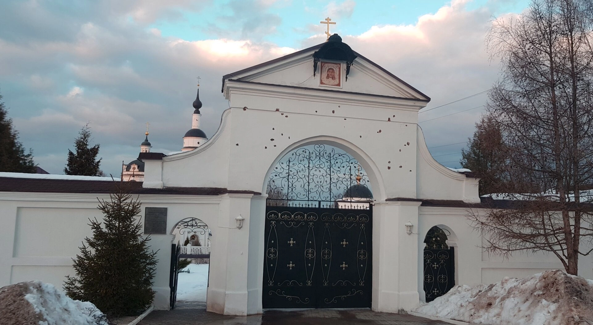 На представленной фотографии запечатлены Святые врата Свято-Никольского Черноостровского женского монастыря, что в древнем городе Малоярославце Калужской земли. Эти врата являются не только входом в обитель, но и символическим порталом между миром земным и горним, что особенно подчёркивается их благолепным убранством и духовной значимостью.