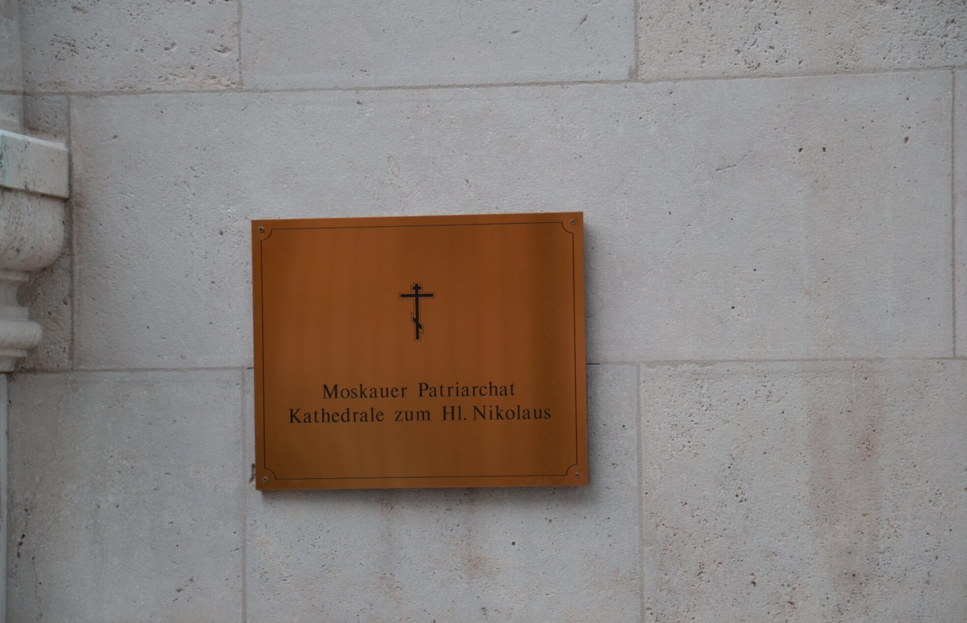 На представленной фотографии запечатлена настенная каменная табличка, расположенная у входа в кафедральный собор Святого Николая в Вене. Табличка, выполненная из светлого камня, содержит официальное наименование храма на немецком языке: «Moskauer Patriarchat Kathedrale zum Hl. Nikolaus», что в переводе означает «Кафедральный собор Святого Николая Московского Патриархата». Венчает композицию православный крест, символизирующий искупительную жертву Христа и утверждающий принадлежность храма к христианской традиции.