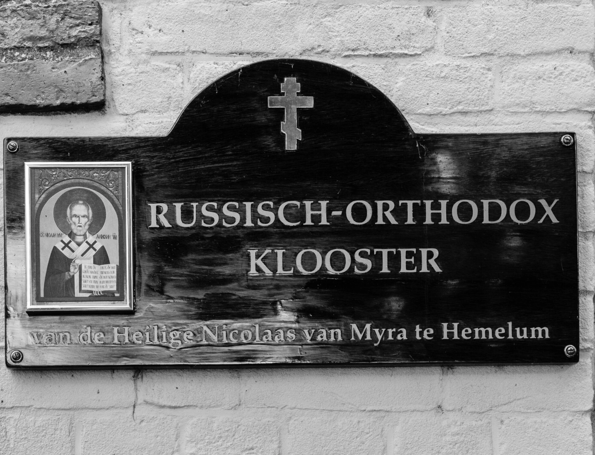 На представленной фотографии запечатлена настенная табличка, размещённая при входе в Русский Свято-Никольский мужской монастырь, расположенный в деревне Хемельум (нидерл. Hemelum) в провинции Фрисландия, Нидерланды. Табличка выполнена на нидерландском языке и содержит официальное название обители: «RUSSISCH-ORTHODOX KLOOSTER van de Heilige Nicolaas van Myra te Hemelum», что в переводе означает «Русско-православный монастырь Святого Николая Мирликийского в Хемельуме».