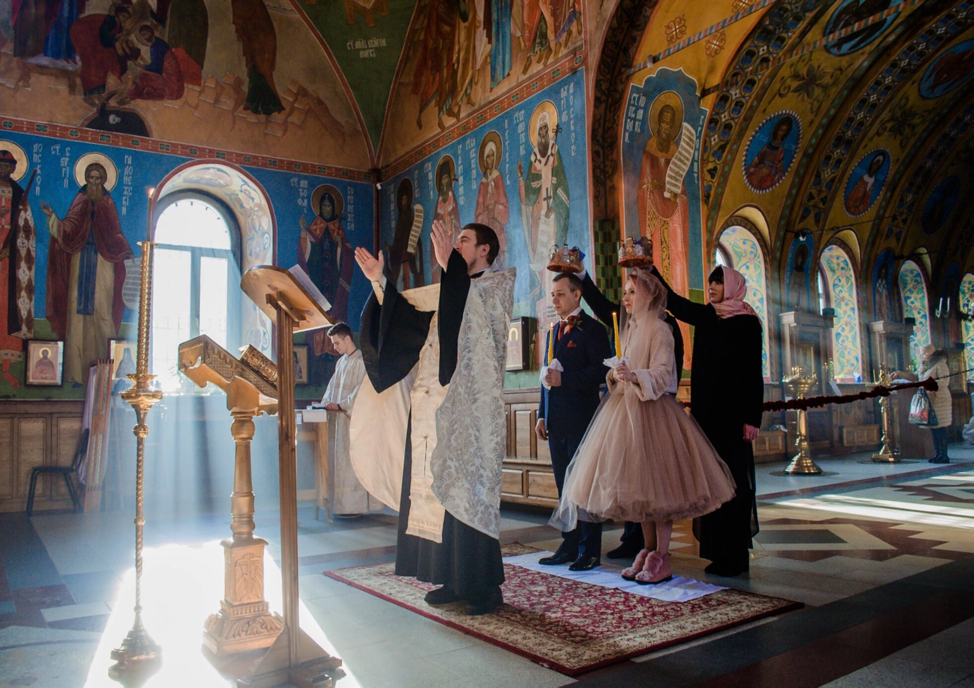 Успенский храм, в стенах которого происходит венчание, является одним из старейших в Воронеже и обладает богатой историей. Совершение здесь таинства брака подчёркивает его непреходящую ценность и духовную значимость для православных христиан. Фотография передаёт не только внешнюю сторону обряда, но и глубокий сакральный смысл соединения двух судеб перед лицом Бога.