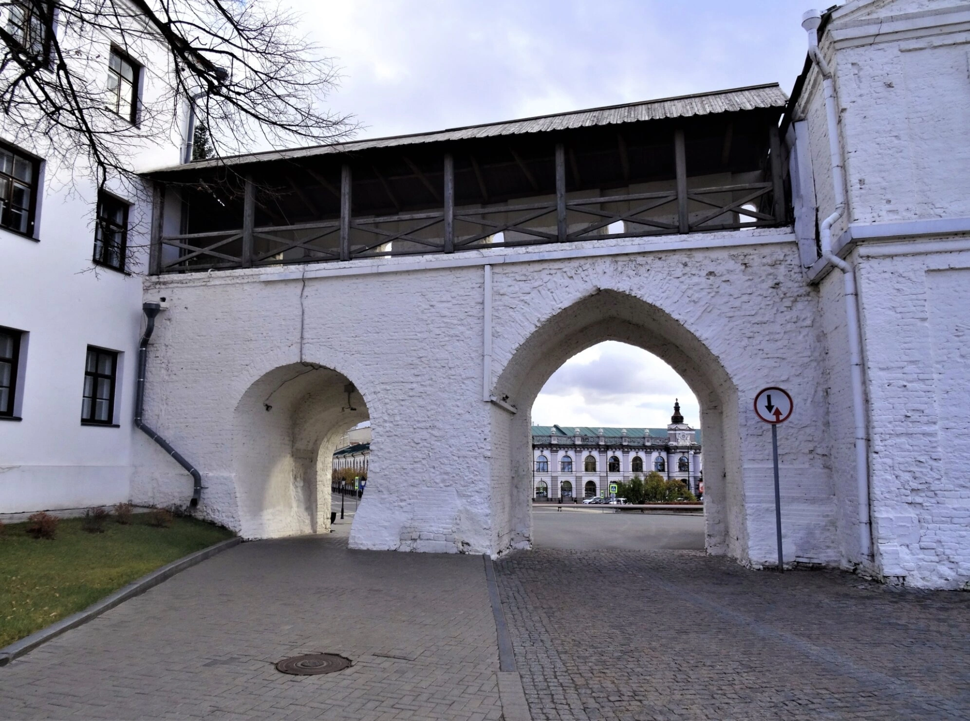 Справа от ворот установлен дорожный знак «Проезд запрещён», что подчёркивает особый охранный статус данной территории. Весь архитектурный комплекс находится под защитой государства как объект культурного наследия народов Российской Федерации.