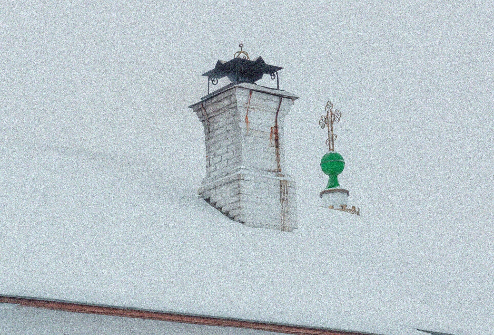 В центре композиции находится печной дымоход, что указывает на наличие системы отопления в данном храме, что и дало ему народное название «тёплый», в отличие от «холодного» летнего храма. Справа возвышается изящный луковичный купол, увенчанный восьмиконечным православным крестом, сияющим на фоне неба. Главы таких куполов традиционно символизируют пламя свечи, устремление к Богу и горний мир.