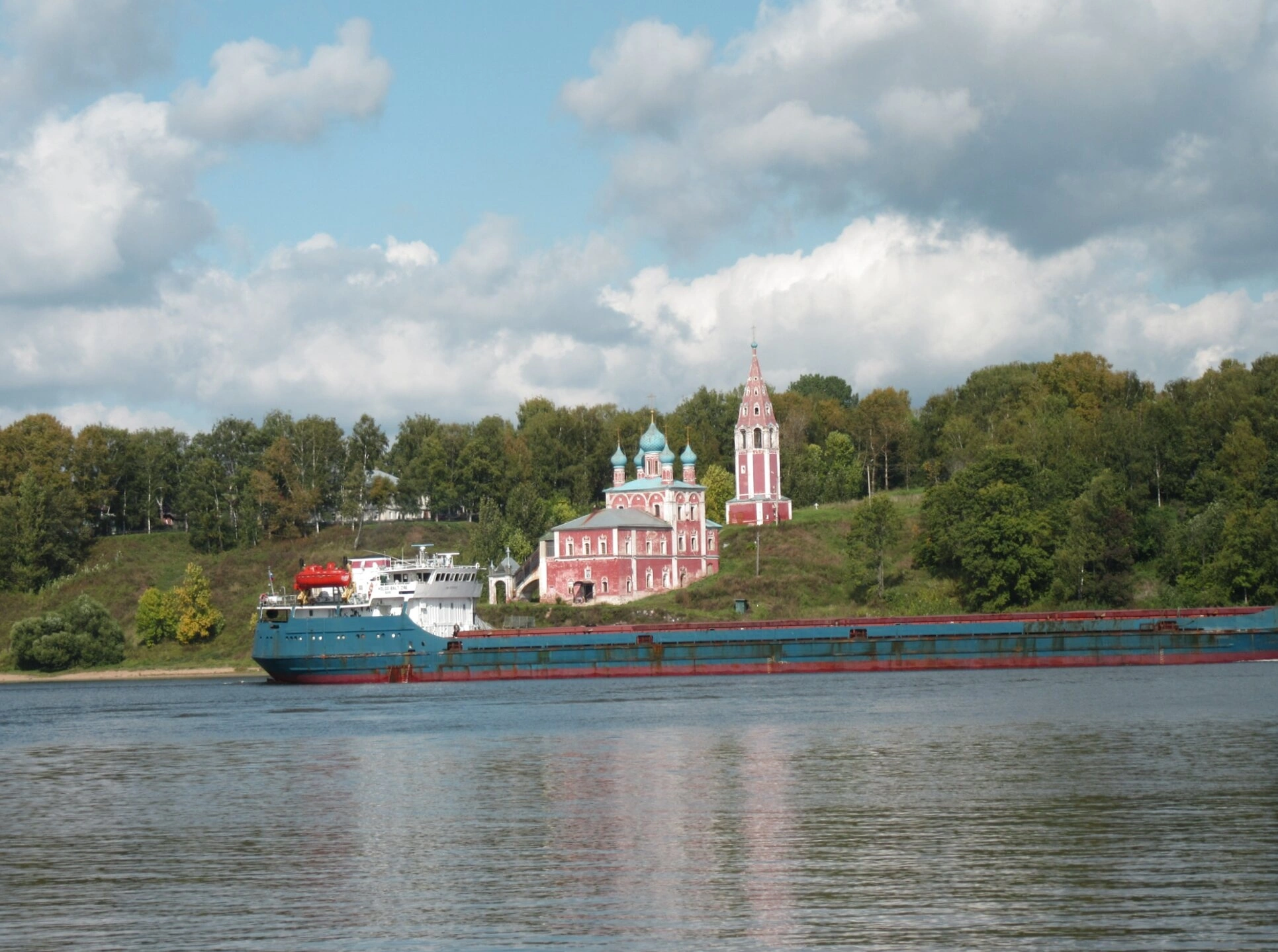 - Теплоход на фоне Казанско-Преображенской церкви в Тутаеве