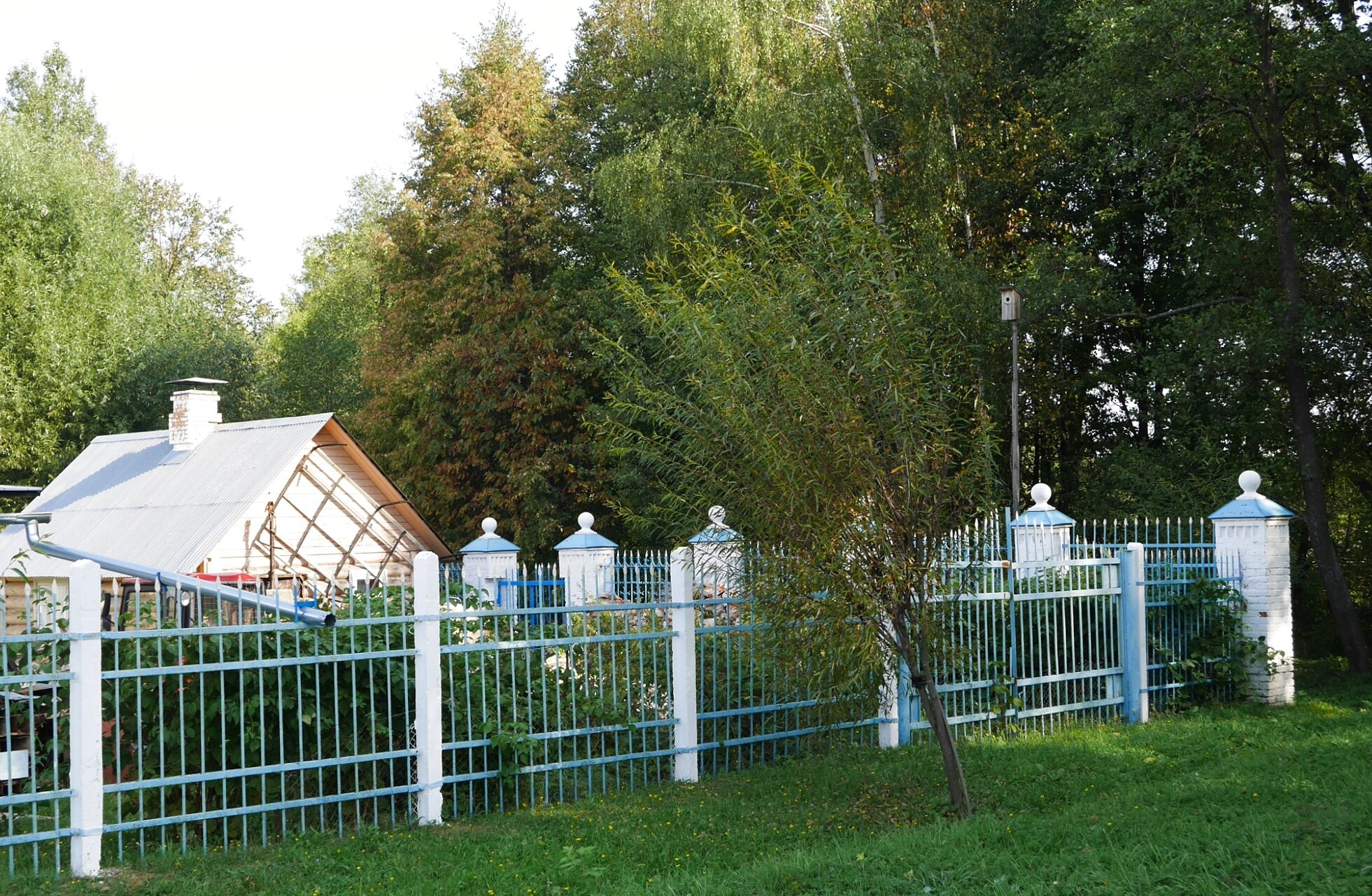 Перед домом установлена аккуратная металлическая ограда, выкрашенная в светло-голубой цвет — традиционный для православной архитектуры, символизирующий небесную чистоту и Богородицу. Столбики ограды белого цвета увенчаны лаконичными декоративными элементами, что придает всему виду законченность и строгость.
