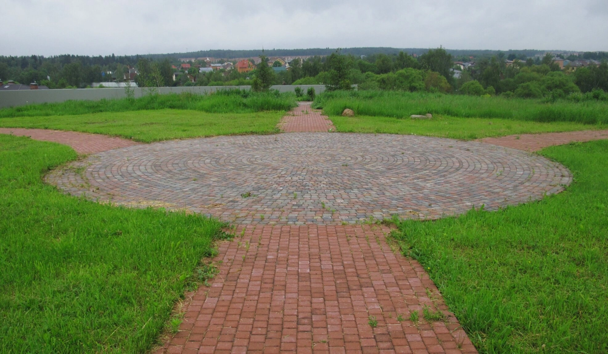 На представленной фотографии запечатлён фрагмент благоустроенной территории храма Сошествия Святого Духа, расположенного в посёлке Первомайское Калужской области. Центральным элементом композиции является круглая площадка, аккуратно вымощенная каменной брусчаткой. От неё подобно лучам расходятся прямые дорожки, ведущие к различным зонам церковного двора и к самому храму.