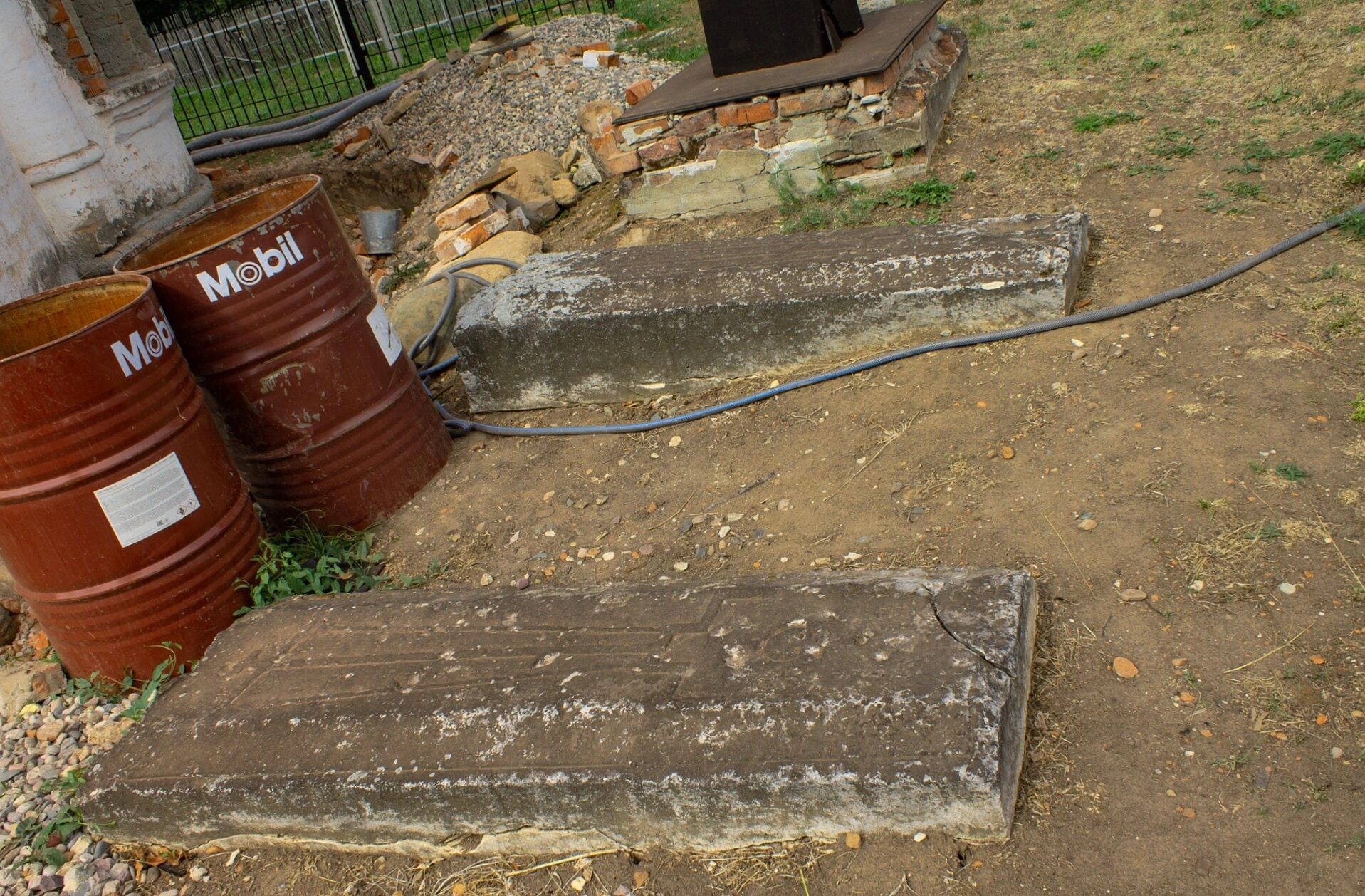 Несколько диссонирующим элементом композиции выступают две металлические бочки с нанесённым логотипом нефтяной компании, которые создают контраст с духовной атмосферой церковного подворья. На заднем плане фотографии просматриваются фрагменты кирпичной кладки, вероятно, остатки церковных построек или ограждения, а также складированные строительные материалы и металлические конструкции.