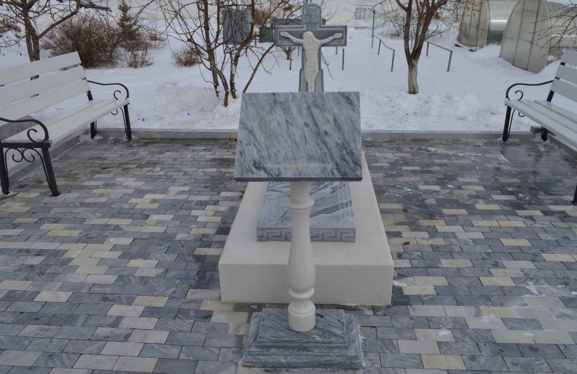На представленной фотографии запечатлена территория Свято-Казанского женского монастыря, расположенного в городе Троицке Челябинской области, в благоговейной тишине зимнего времени. В центре композиции находится церковный аналой из светлого мрамора с благородными темными прожилками, установленный на каменном постаменте. Этот священный предмет предназначен для возложения богослужебных книг или икон во время совершения молитвенных правил и крестных ходов на открытом воздухе.