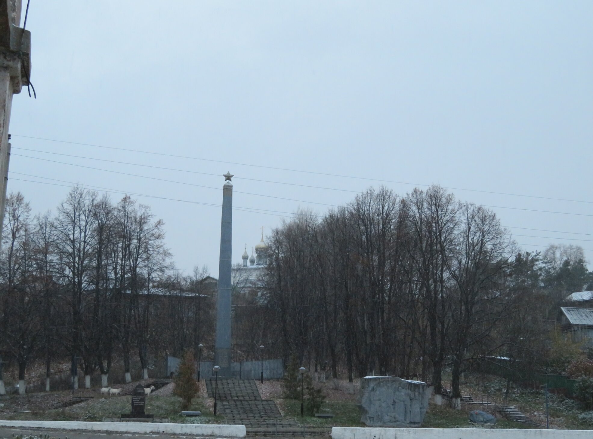 На представленной фотографии запечатлён значимый архитектурно-мемориальный комплекс города Козьмодемьянска, расположенный по координатам 56.339997, 46.584613. На переднем плане возвышается монументальный памятник советскому лётчику-герою Великой Отечественной войны, представляющий собой строгую стелу, увенчанную красной звездой — символом доблести и самопожертвования воинов-авиаторов. К подножию мемориала ведёт широкая каменная лестница, подчёркивающая торжественность и величие памятного места.
