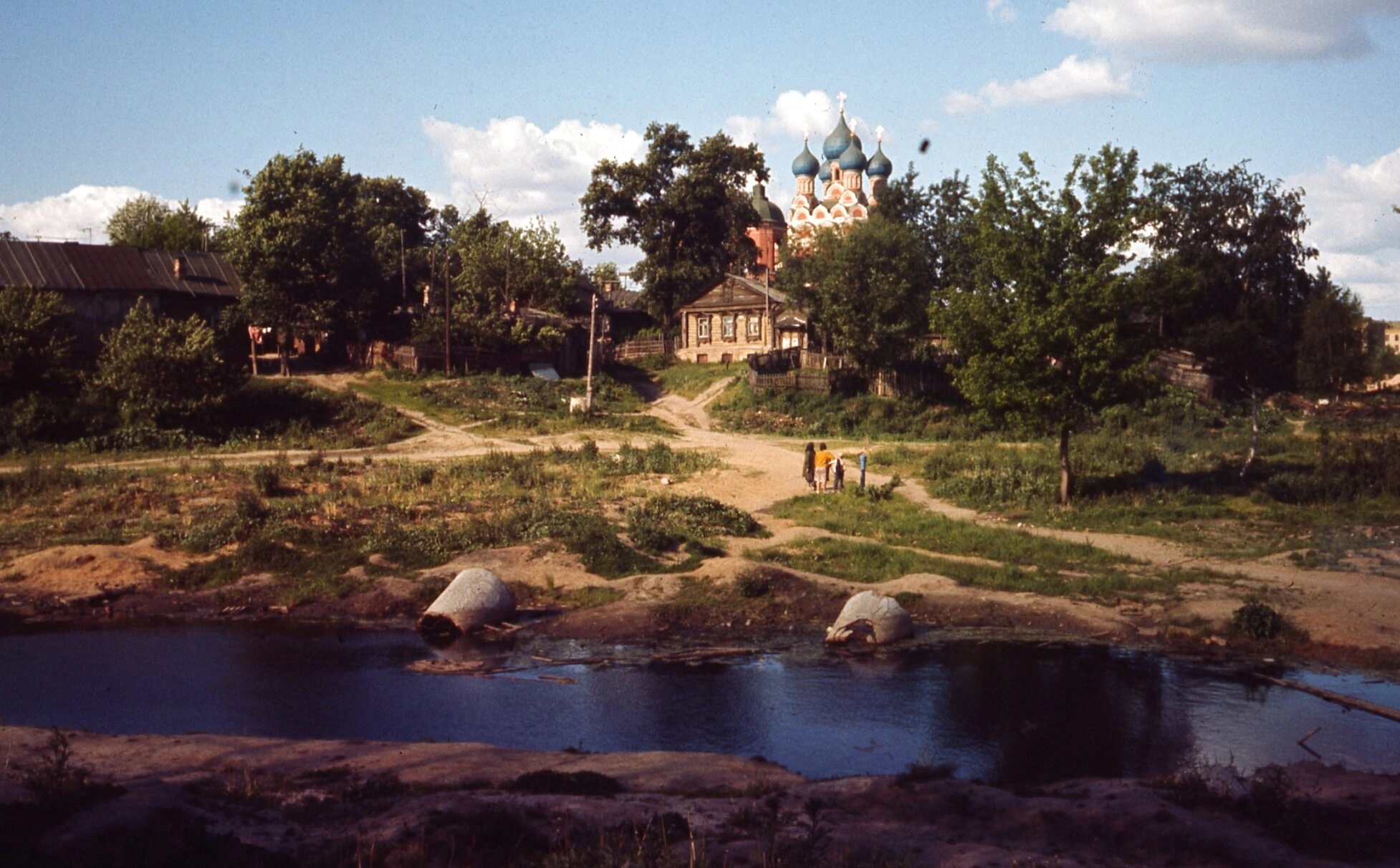 На переднем плане фотографии видна река Копытовка, ныне заключенная в коллектор. На ее берегу расположены две большие бетонные трубы, свидетельствующие о начале работ по благоустройству территории. Между рекой и церковной оградой сохранились несколько деревянных домов традиционной сельской застройки, грунтовые дороги и тропинки, окруженные густой растительностью.