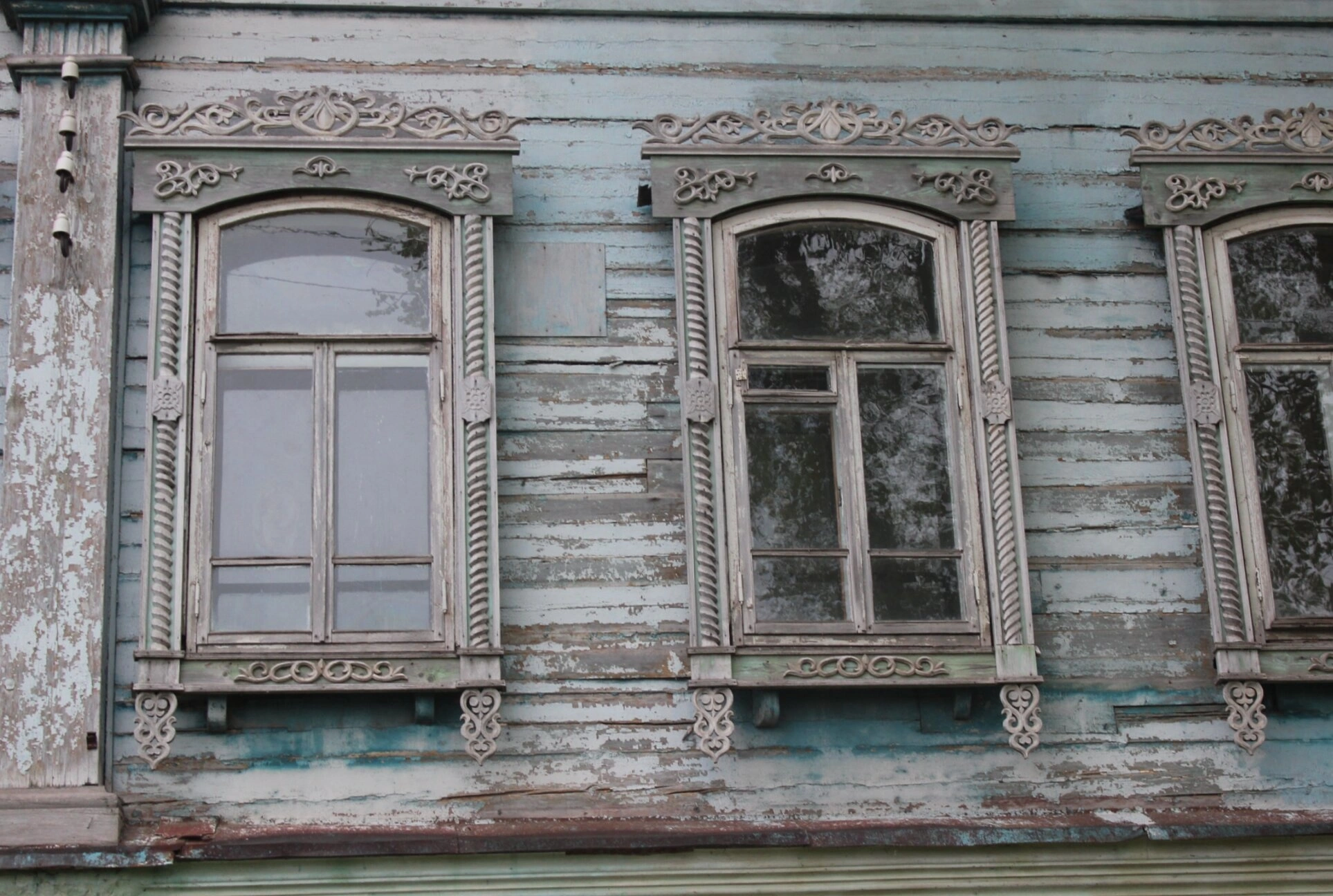 На представленной фотографии запечатлён фрагмент фасада Тихвинской церкви, расположенной в городе Козьмодемьянске. Святыня представляет собой выдающийся образец деревянного храмового зодчества, выполненный в традициях православной архитектуры.