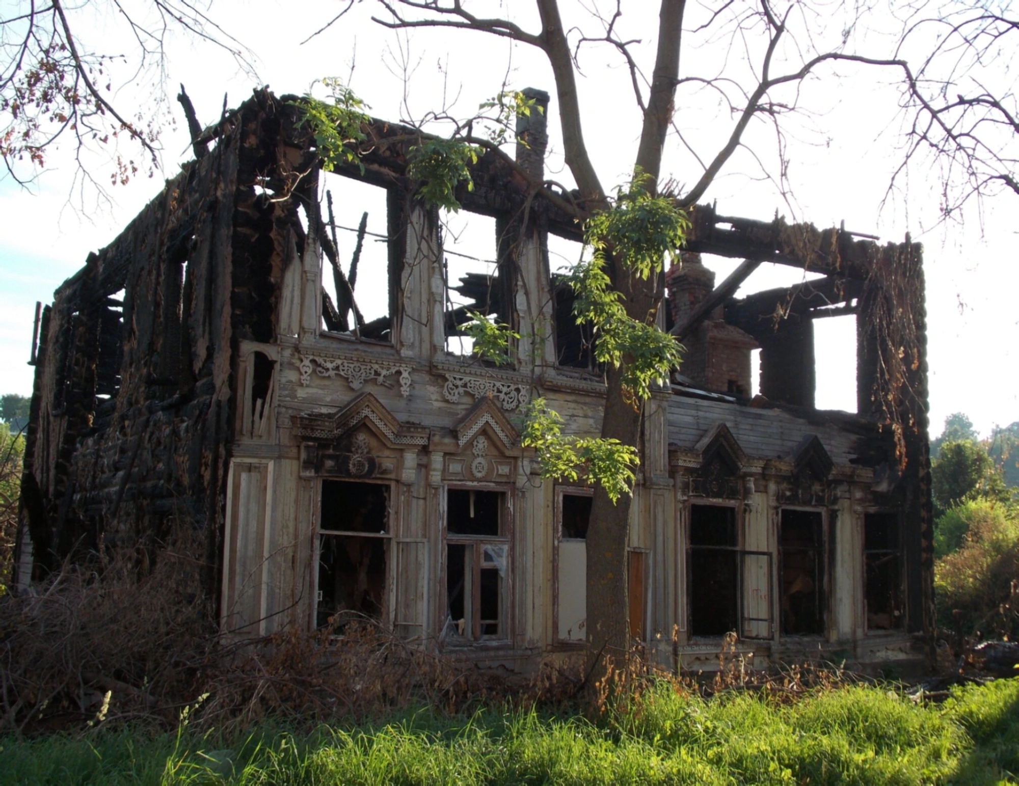 На представленной фотографии запечатлена полуразрушенная Тихвинская церковь в городе Козьмодемьянске, являющаяся памятником деревянного зодчества. Храм, освящённый в честь Тихвинской иконы Божией Матери, пребывает в состоянии запустения после произошедшего пожара.