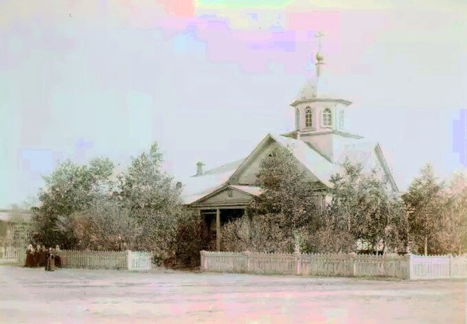 На представленной фотографии запечатлён Тихвинский Богородицкий женский монастырь, располагавшийся в городе Бузулуке Оренбургской губернии, ныне — Оренбургской области. Монастырский комплекс, окружённый невысокой оградой и тенистыми деревьями, демонстрирует характерную для русского церковного зодчества архитектуру. Деревянный храм увенчан традиционным куполом и православным крестом, возносящимся к небу, что символизирует глубокую веру и духовные устремления насельниц обители.