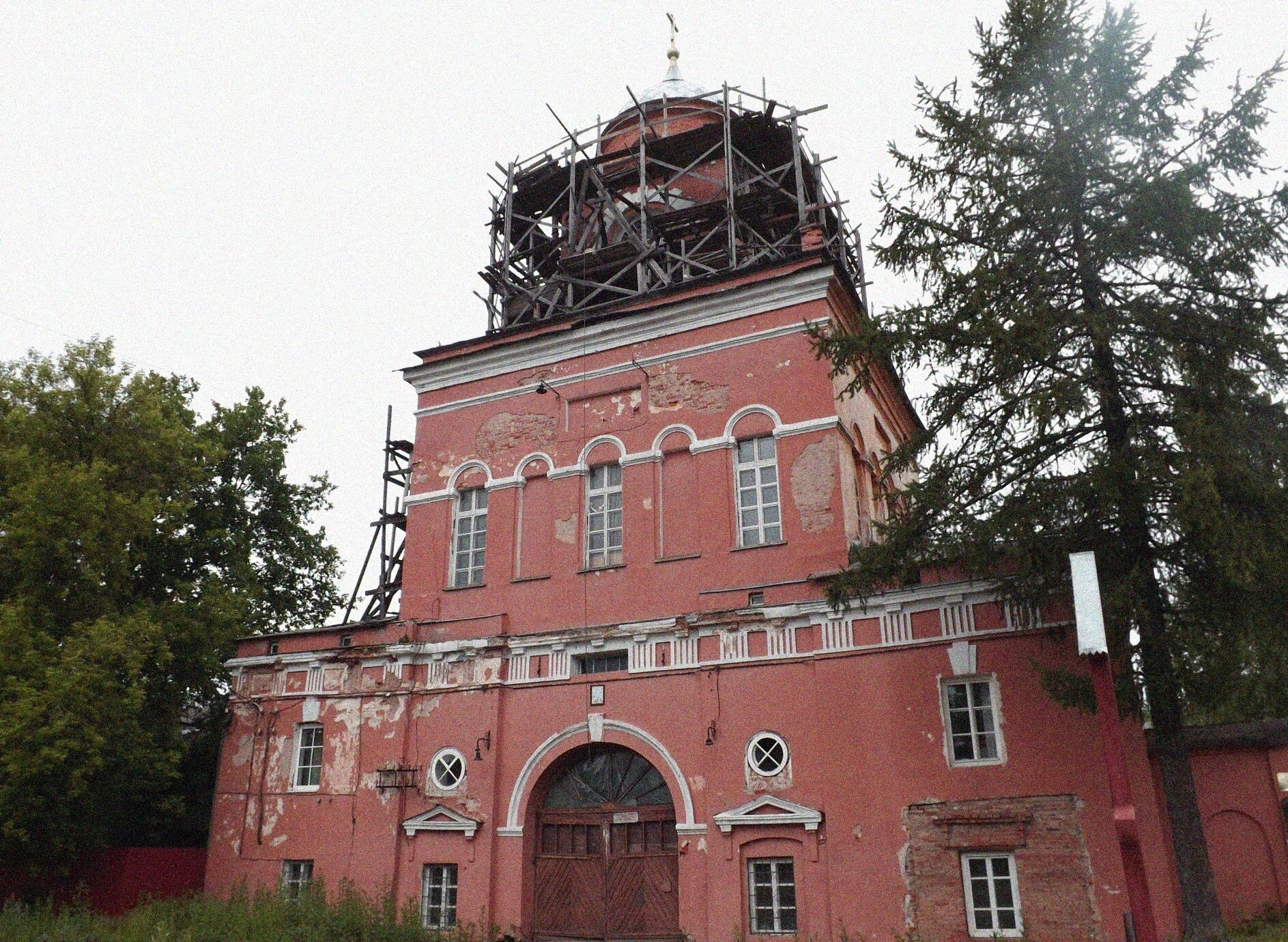 Здание выполнено из красного кирпича с выразительными белыми декоративными элементами, характерными для русской церковной архитектуры конца XIX — начала XX веков. В нижней части фасада выделяется арочный вход, обрамлённый белым камнем, а также несколько окон с арочными завершениями и белыми рамами. Справа от здания возвышается хвойное дерево, которое дополняет природный ландшафт святой обители.