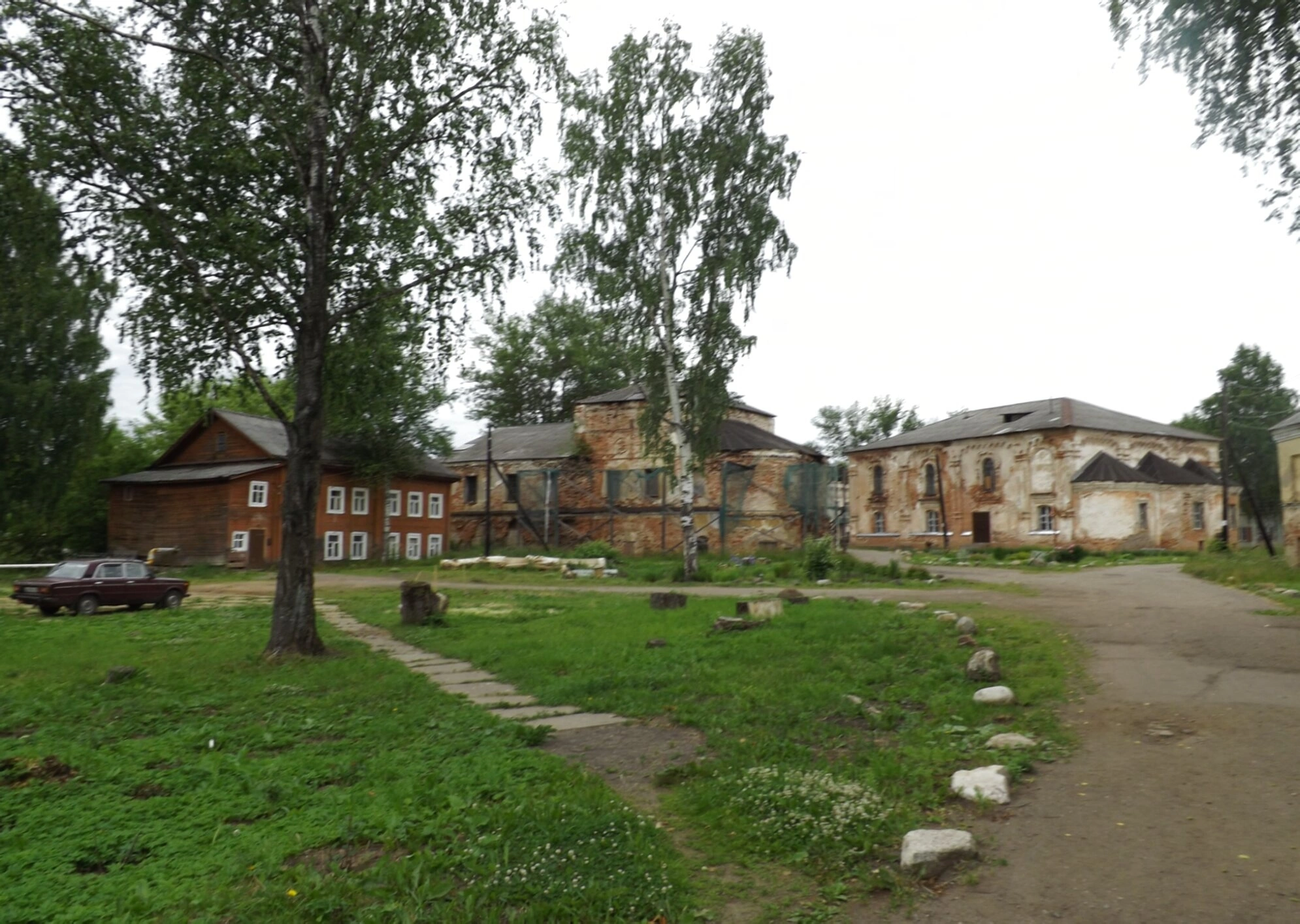 Территория обители утопает в зелени: высокие берёзы, символически напоминающие о духовном возвышении и чистоте, окружают строения. Грунтовая дорога, протоптанная вдоль зданий, ведёт к главным святыням монастыря, приглашая к неспешной прогулке и богомыслию. По краям тропинки заметны камни, аккуратно обозначающие её границы.
