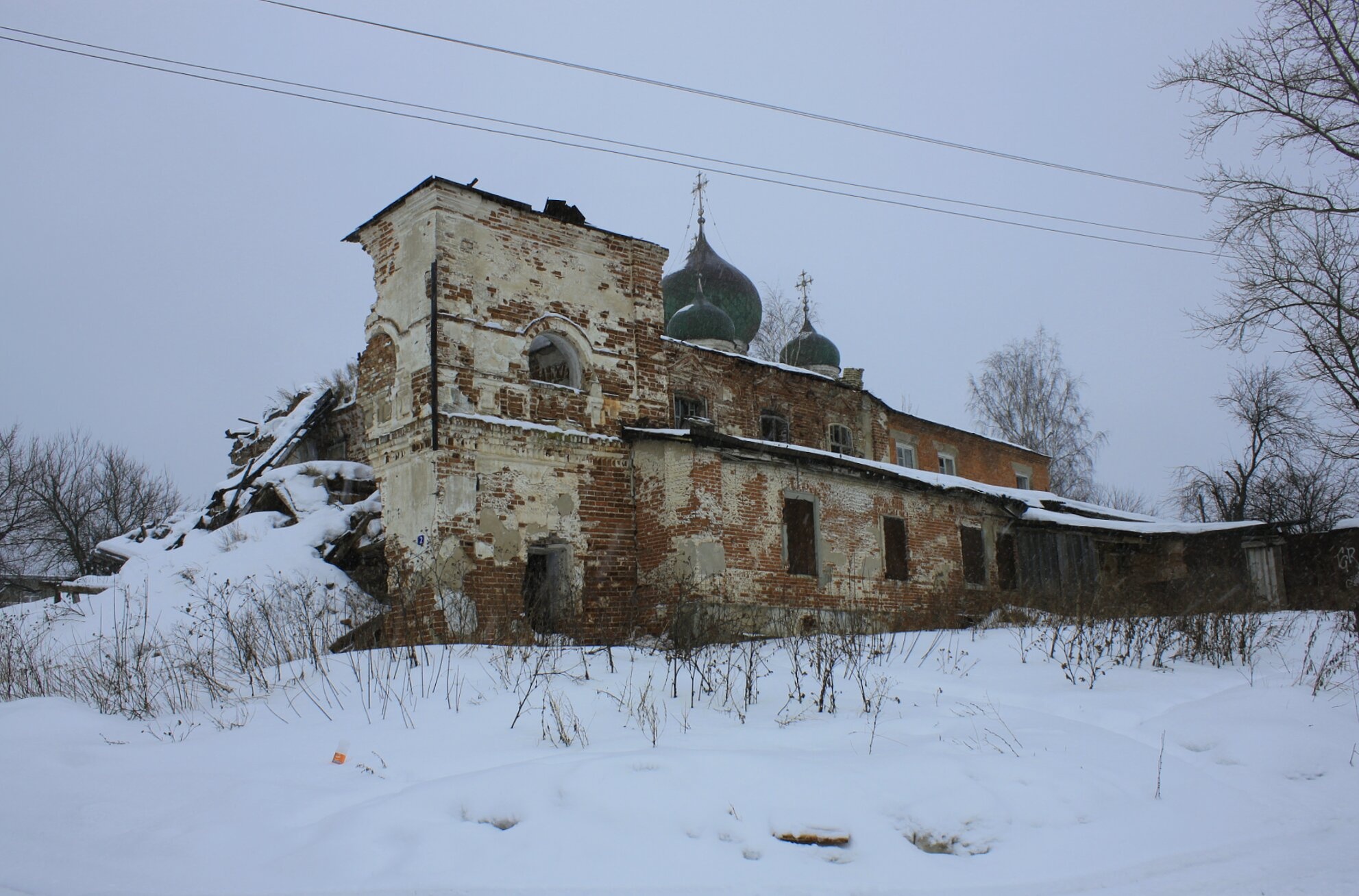 На представленной фотографии запечатлена трапезная церковь Рождества Пресвятой Богородицы, входящая в комплекс Спасо-Преображенского мужского монастыря города Арзамаса. Снимок сделан в зимний период, что подчеркивает суровость и трагичность состояния данного православного объекта.