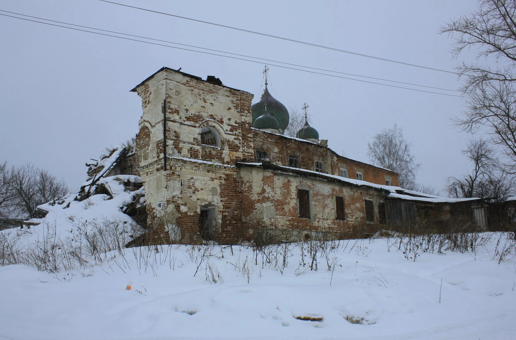 Фасад храма имеет заколоченные дверные проемы и оконные openings, что указывает на длительное отсутствие ремонтных работ и богослужебной жизни. Часть кровли пристроек покрыта снежными массами, создающими дополнительную нагрузку на аварийные конструкции. Окружающая территория покрыта снежным покровом, вблизи здания произрастают кустарники и лиственные деревья без листвы, что соответствует зимнему сезону. Пасмурное небо с серыми облаками усиливает melancholic настроение фотографии.