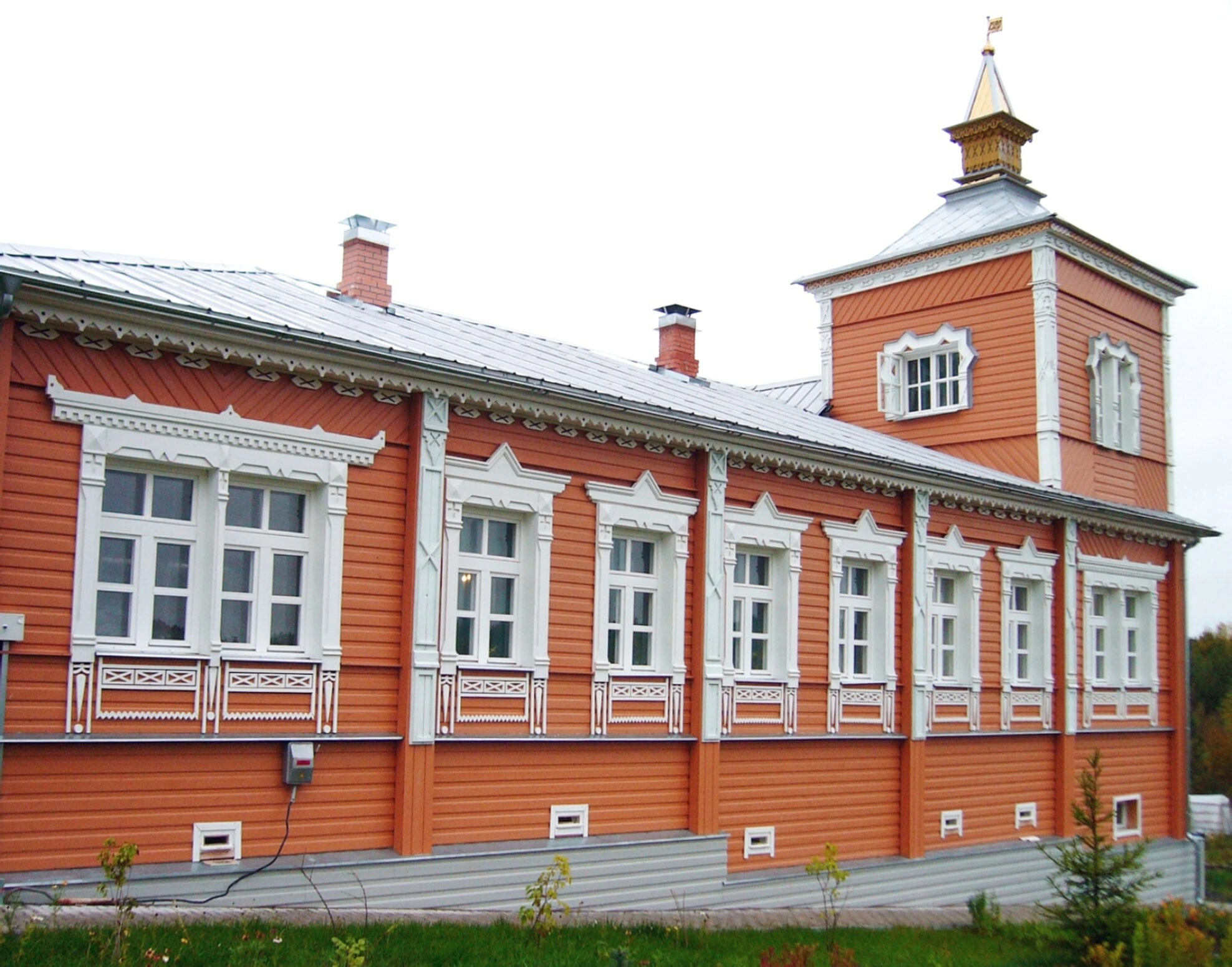 Архитектурный облик здания украшен резными наличниками, традиционными для русского деревянного зодчества. С правой стороны сооружения возвышается небольшая башня, увенчанная куполом и шпилем с православным крестом, свидетельствующим о назначении постройки. Металлическая крыша и две кирпичные трубы дополняют практичный облик монастырского строения.