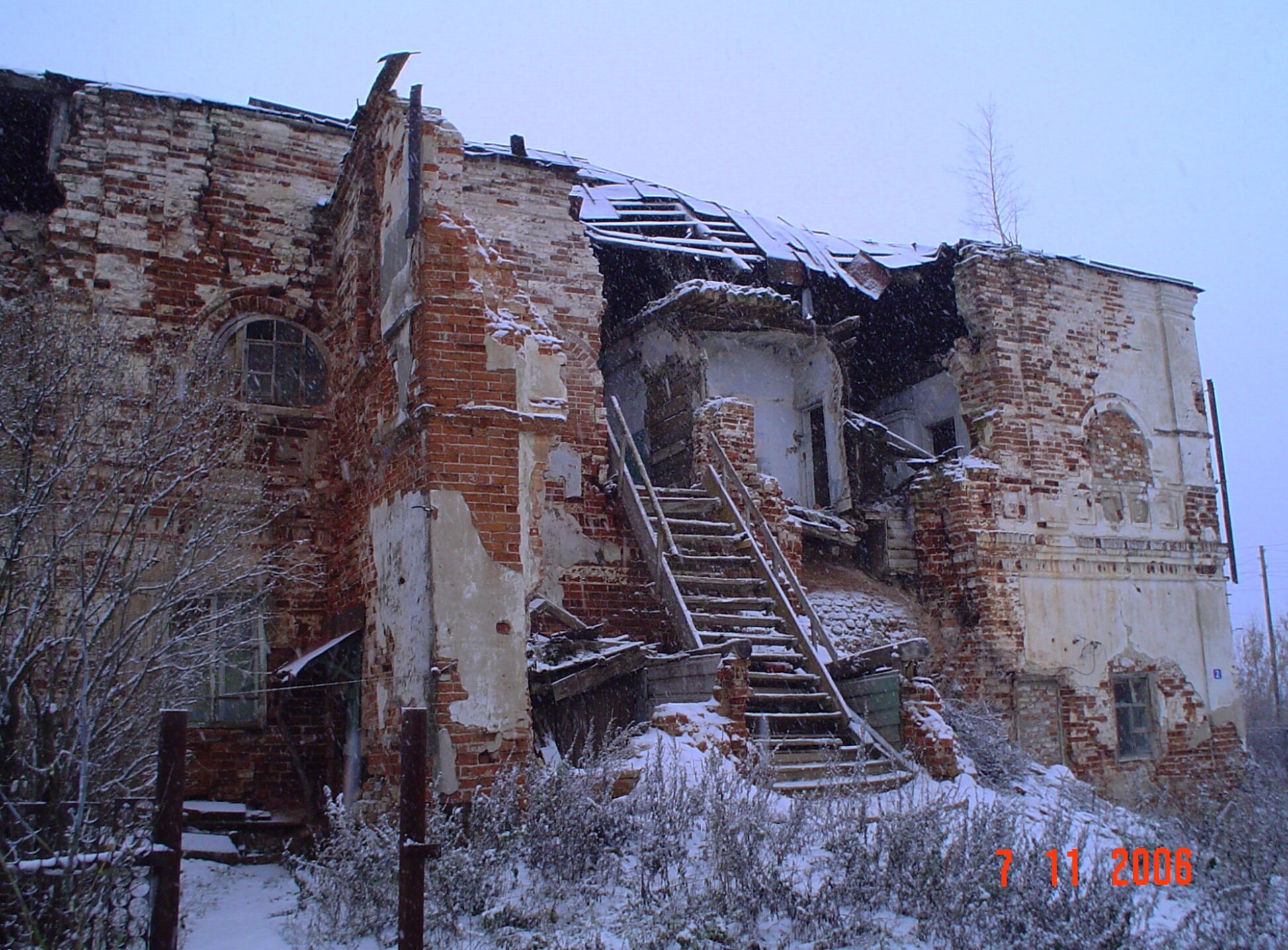 Здание трапезной, выполненное из красного кирпича, находится в удручающем состоянии. Кирпичные стены частично разрушены, кровля полностью обвалилась, а внутренние помещения открыты воздействию непогоды. Снежный покров, укутывающий руины, подчёркивает заброшенность и запустение этого некогда благолепного места.