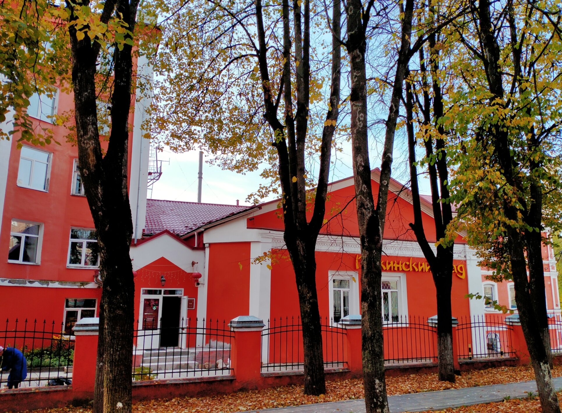 Перед церковным строением расположен изящный белый забор с черными коваными элементами, характерный для традиционного русского церковного зодчества. Вдоль ограды произрастают деревья, облаченные в осеннее золото листвы, что свидетельствует о съемке в осенний период. Земля у храма выложена плиткой, на которой видны опавшие листья, добавляющие кадру особую лиричность.